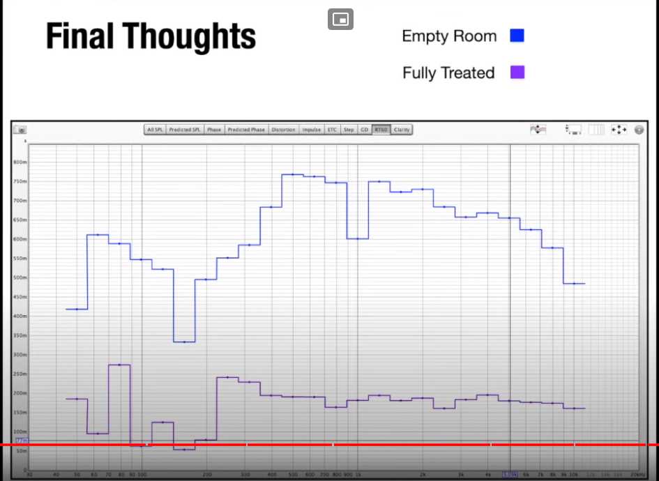 Підготовка КДП тема хороша і цікава, але мало хто із не професіоналів цим займається. В принципі, зрозуміло чому, якщо навіть не брати ціну, то об'єм поглиначів, щоб значно вплинути на реверберацію, демотивує. Якщо брати за таргет 0,2с як в першому відео, то знадобиться десь 600-700 літрів мінвати, для кімнати в 20м2. І цей об'єм не дуже допоможе із найбільшими провалами на басах.