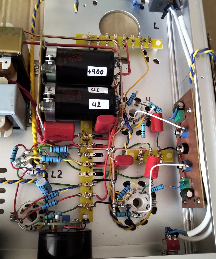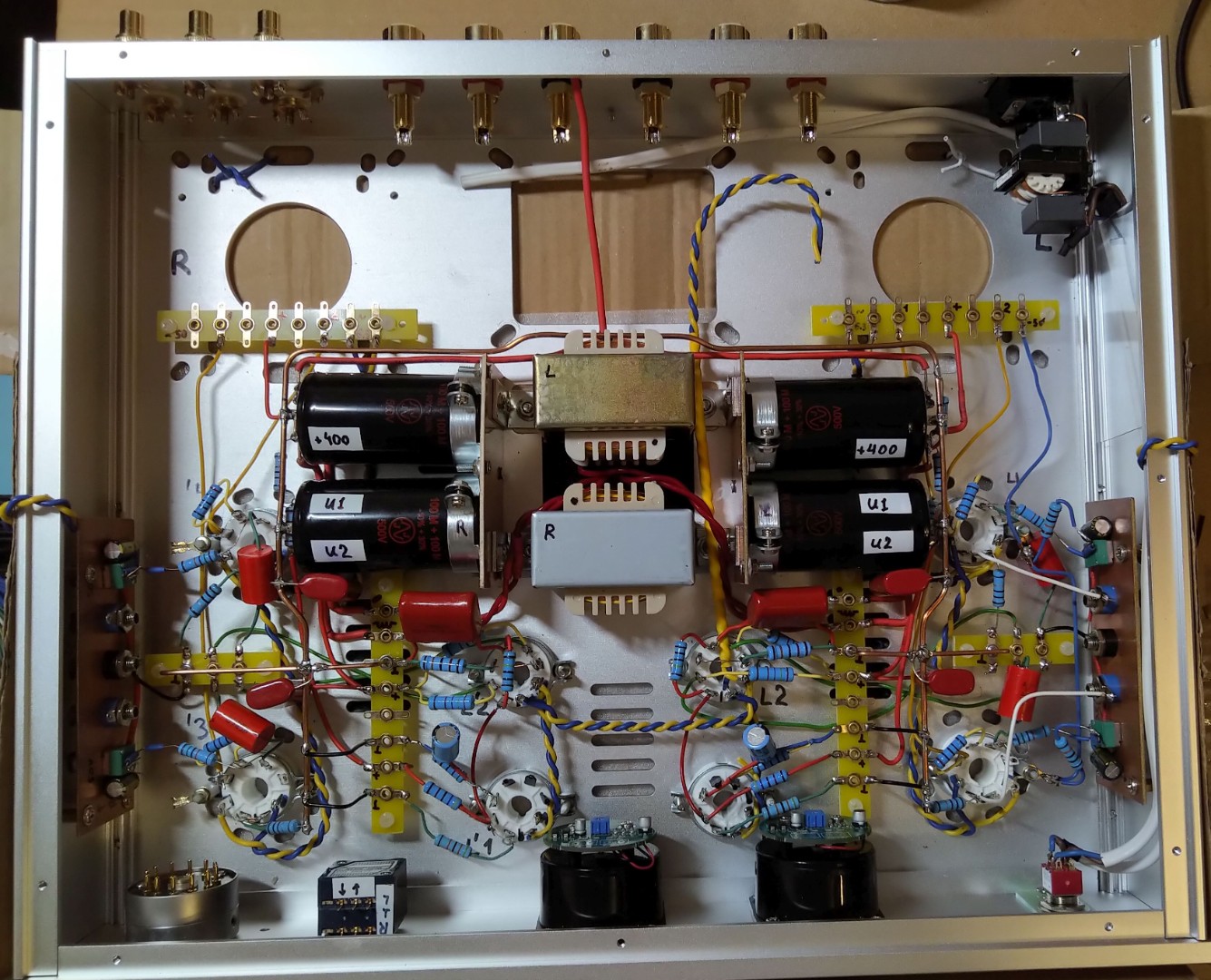 Схему "приготовил" таким образом, чтобы была разбита на элементы, функционально находящиеся рядом (в данном случае на ламелях ламповых панелек). В китайском корпусе (явно сделанный под конкретный усилитель), на обратной стороне верхней панели высверлены отверстия и нарезана резьба под крепление промежуточных клемм.