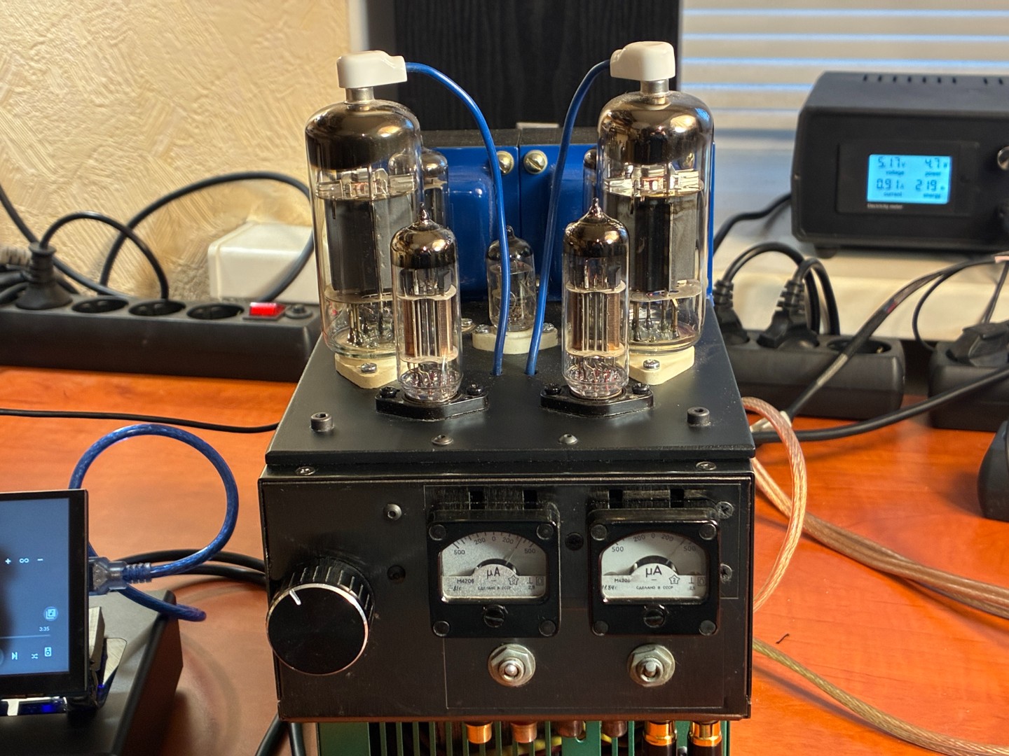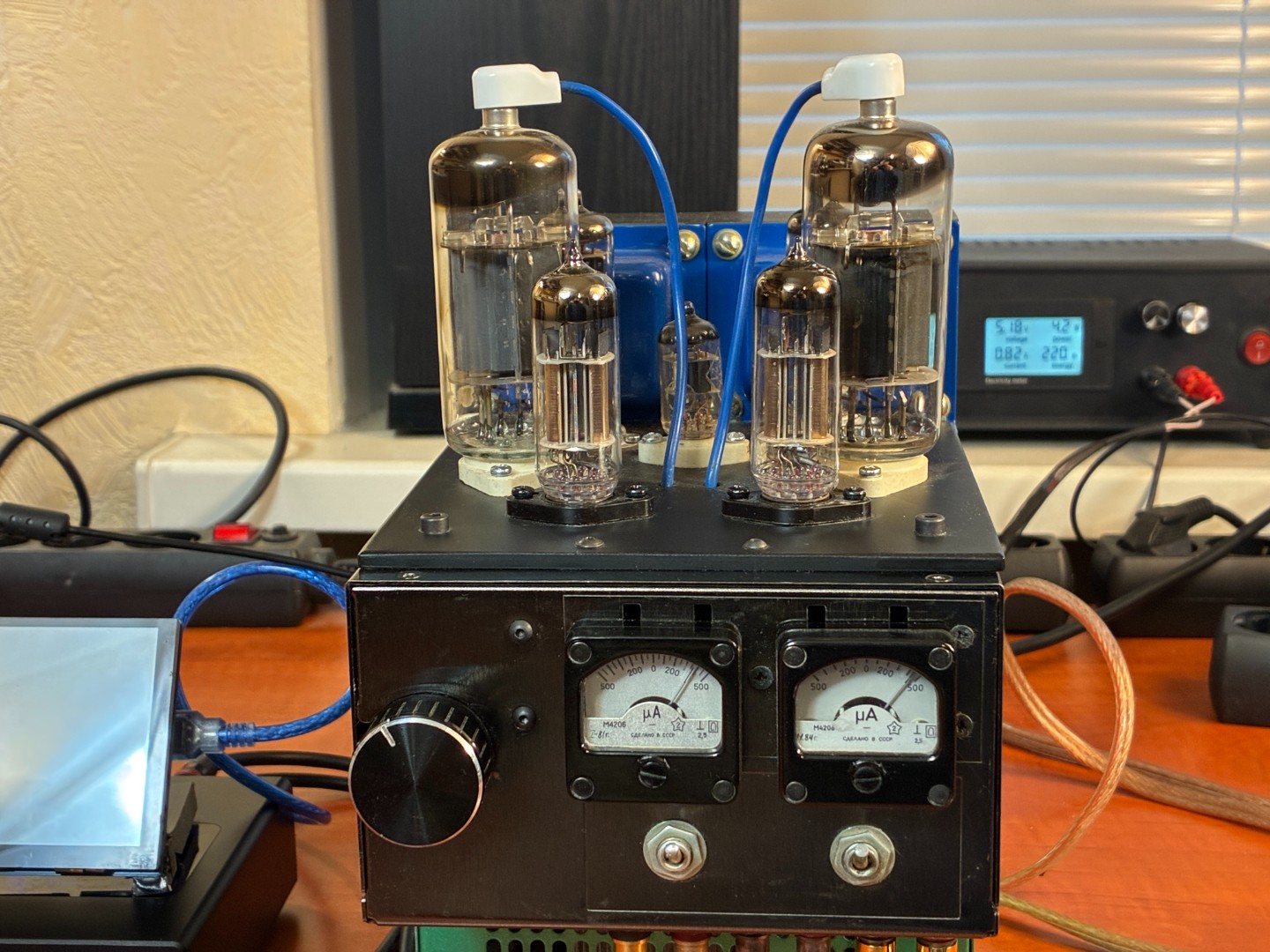 - индикация величины тока покоя ламп выходных каскадов (не разбирая корпус, можно судить о том, что пришло время подстроить режим или заменить лампу)