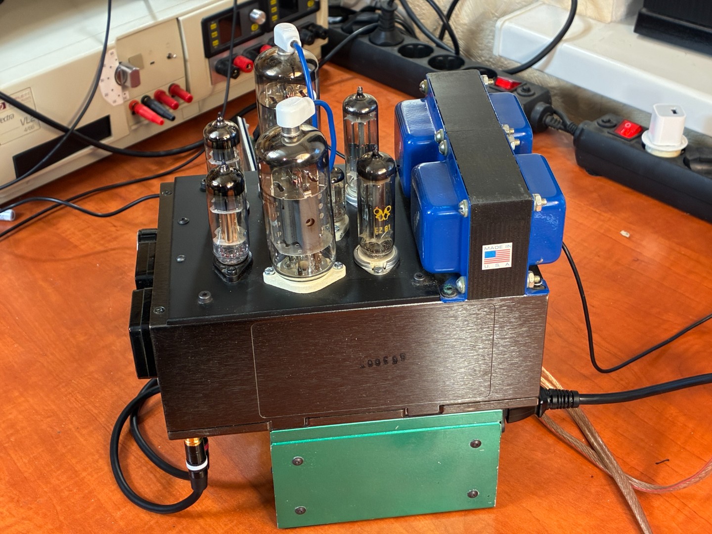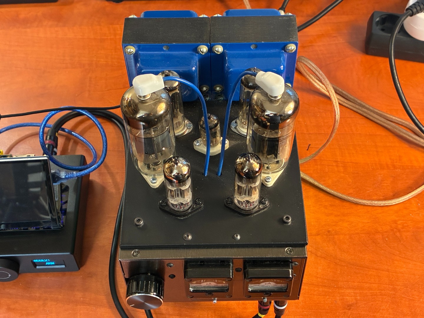 Попросил LinuxManiac выслать для тестов свой ламповый усилитель. Сделан конечно оригинально. Внизу корпус компьютерного блока с трансформатором. Сверху выходные трансформаторы и лампы.