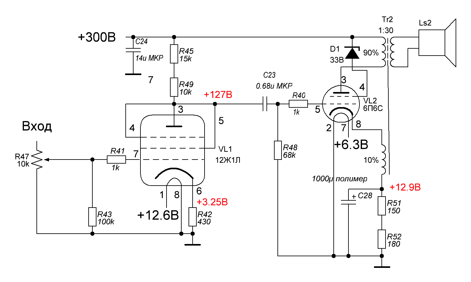 Или ту же самую 12Ж1Л в пентоде (Ra = 36k, Ug2 = 75V, Rk* = 180 Ohm - подобрать по напряжению на катоде 1-1,2 вольта).
