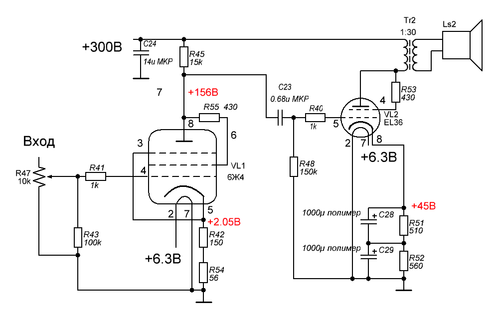 Смещение EL36 для получения тока анода около 45мА составляет 46 Вольт