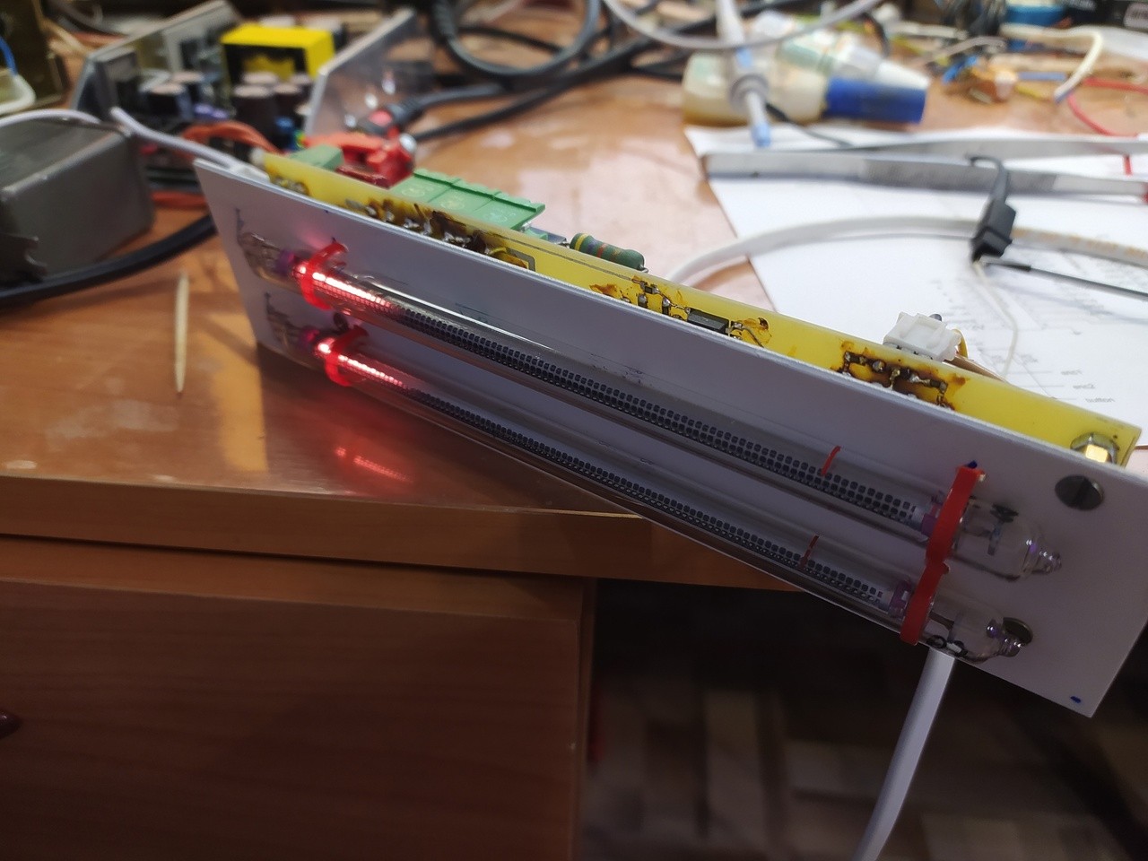 ещё поигрался конденсаторами. Поставил МБГО на 10мкФ в питание и МБГЧ на 0.5мкФ между каскадами. Плёнку выкинул совсем. Последняя плёнка, которую попробовал - красненький Audiophiler на 1мкФ с платы китайского усилителя ТА2024. Она, пожалуй, получше всех других будет, что я пробовал в межкаскадное место. Но всё-равно песочит. Хотя, в остальном тембр с ней что нужно. Практически как у МБГЧ. И вот такие работы по блоку управления. Пока ещё ULN2003 нету, и дистанционного управления. Потом допаяю и вымою всё красиво. ПОка можно только на прыгающие столбики полюбоваться. И вроде бы неплохо так прыгают. Сделал не совсем линейное движение столбиков от напряжения. Через квадратный корень изогнул