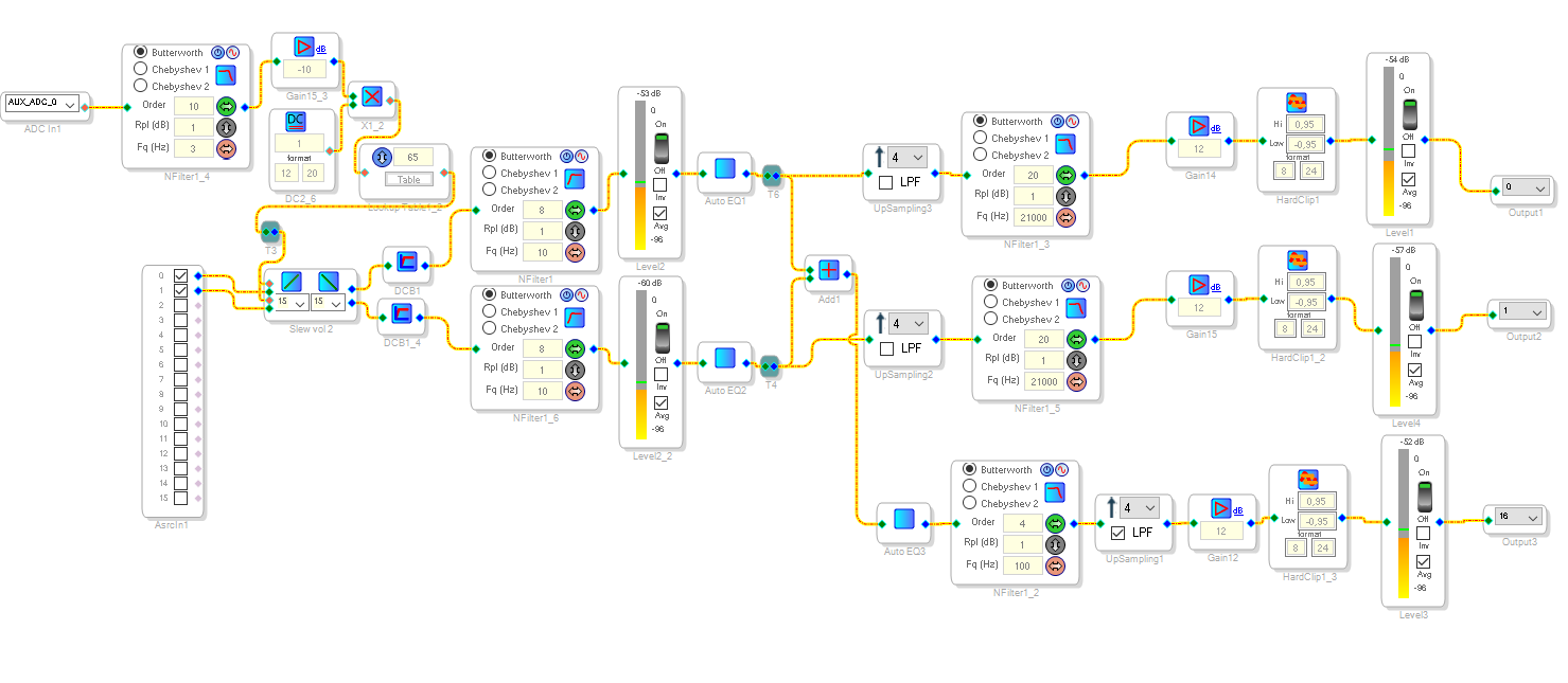 Если вы хотите на основании этих плат делать цифроактивную трёхполосную АС, или двухполоску плюс саб, то нужно использовать две таких платы, и для передачи сигнала от одной платы к другой, используется передатчик спдиф сигнала, в дсп есть функция транзита спдиф сигнала т.е. в итоге обе платы будут получать одинаковый стерео спдиф, и уже далее внутри проекта сигма студио вы выбираете тот канал, который вам нужен для данной АС. Кстати в папке с проектами, которую я прикрепил ранее, есть базовый проект деления полос с помощью КИХ фильтров т.е. деление полос без изменения фазы сигнала на частоте раздела полос, что очень сильно облегчает сведение трёхполоски, ради интереса скачайте сигма студио https://www.analog.com/en/resources/eva ... e-overview и откройте проекты которые я прикрепил, мощность этого дсп в плане обработки звука очень велика, с его помощью можно любую старую многополосную хай фай колонку вывести на принципиально новый уровень, если есть микрофон и желание.