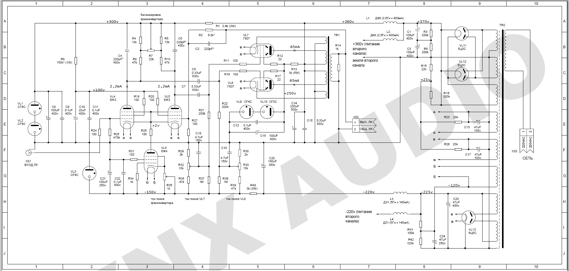 Наконец, в качестве примера - схема одного из усилителей Lynx Audio. Применены 3 кенотрона и 5 газовых стабилитронов в одном канале.