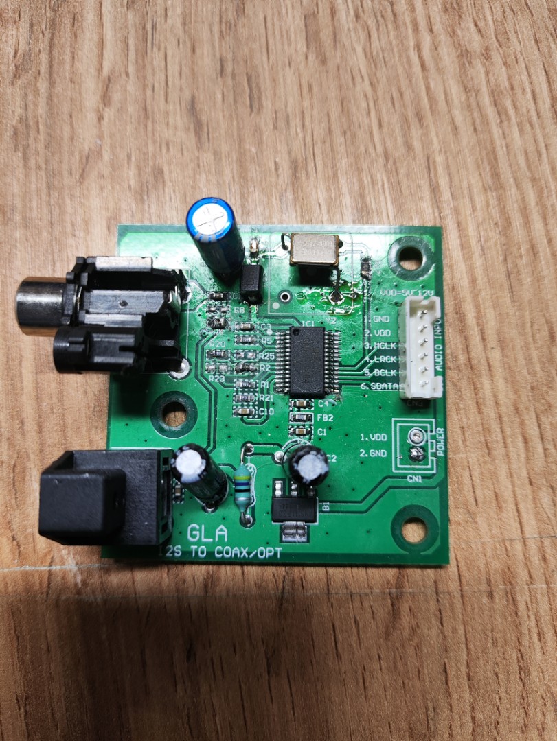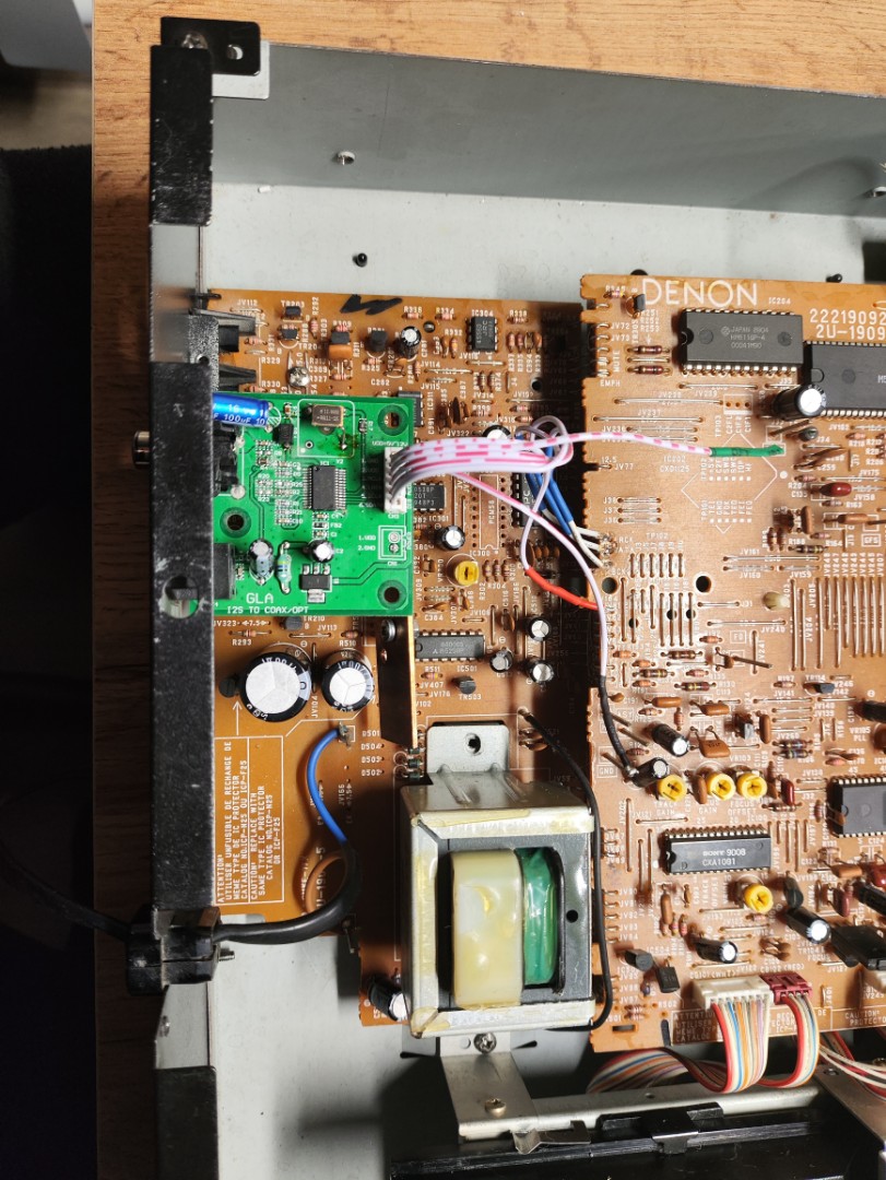Лежал у меня сд плеер Denon DCD-520. Механика вроде неплохая, а звук был k@k@шка. Преобразование цифры в звук в нем на чипе PCM56, это 16-битный цап и по отзывам вроде неплохой. Но это моно цап, а в схеме сд было реализовано его даташитовское включение в стереорежиме когда с помощью коммутатора переключают выборку левого и правого каналов на один моночип. Финансово это видимо было выгодно. но звук точно не озонировало :D . А поскольку у меня лежало десятка полтора фирменных копакт дисков меня не покидала надежда выудить из сидишника нормальный звук чтобы их иногда слушать. Было произведено несколько подходов, нашел кусок даташита на звуковой процессор и там вроде был выход на Спдиф. Нифига. Надо сказать что дотошные японцы указали на плате выходы data bck и lrck, правда формат 16 бит RJ. Подумывал даже пристроить туда преобразователь форматов и какой ни будь современный китайский цапик, но это был бы уже слишком большой огород . А потом попалась на глаза платка с Али на чипе WM8805 преобразование I2S в SPDIF и она принимала 16 бит RJ. Когда платка приехала, оказалось ей еще нужен мастерклок и без него она н работала :( . Попытка пилепить резонатор по даташиту не увенчалась. У WM8805 организовано слишком заумное управление (для меня ;) ). и при подключении резонатора менялась куча параметров. Но на платке была организована поляна под кварцевый генератор, который был куплен и припаян "навесным монтажом", в итоге все заработало. Немножко слесарки и модернизация закончена. Тослинк по оптике завел в цап, качество звука теперь зависит от принимающего цапа. Пробовал припаять на выход спдиф развязывающий трансик -платка не тянет, нужен буфер. В процессе тестирования обнаружил особенность- в паузе между треками прослушивася треск как на грампластинках, причем не всегда и не на всех дисках. когда нажимаешь паузу, треск пропадает. Потом подумал и решил что видимо это оцифровка с винила, мысль понравилась и успокоила :lol: . Все, еще один вопрос закрыт и галочка поставлена. С удовольствием переслушал все свои СД.
