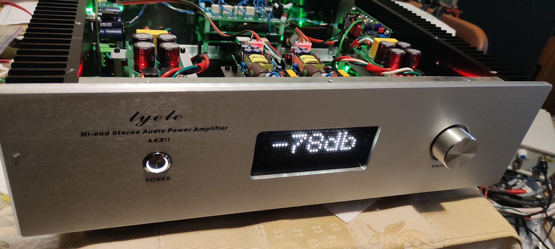 Пока так и слушаю, без верхней крышки. Вживую индикатор смотрится гораздо еффектнее: нет засветов на тонированном стекле. Яркость индикатора немного великовата, но для ее уменьшения надо разобрать половину усилителя, я к этому пока не готов :)