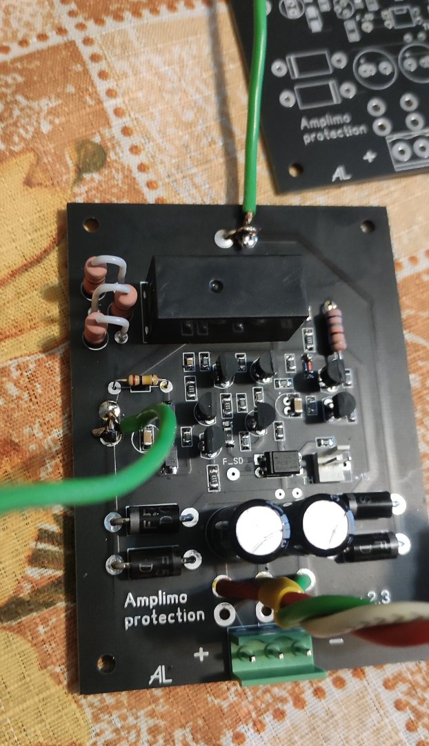 Т.к. большая выходная мощность усилителя мне не нужна, разумным было начать с уменьшения напряжения питания БП с +/-50В на +/-35В. Китайцы прислали с выходными кондерами на 35В, спор ничего не дал (типа пришлите видео, как оно не работает). Заменил на Панасы ФЦ, заодно уменьшил уровень перехода в пакетный режим; при этом напряжение стало +/-37В. Пока БП ехали развел и заказал печатные платы защиты и реле. В итоге вышло так: