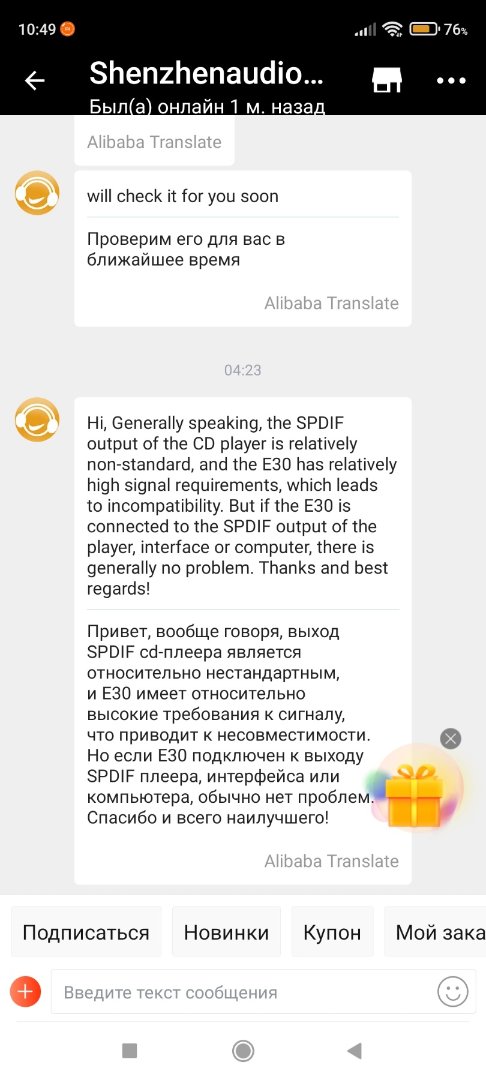 Попал ко мне недавно такой цапик Topping E30. Послушал через юсб вход, ну все нормально. Решил проверить работу коаксиального входа и запустил компакт-диск на DVD Pioneer (600-я серия, точно не помню), ну и подключился соответственно к коаксиальным разъемам. Звук пошел, но стал затыкаться (пропадать на доли секунды) через разные промежутки времени. Думал посыпался диск. Поставил другой диск, третий, та же история. Ну ладно бы один посыпался, но сразу три!!? Подключаю двд-проигрыватель по коаксиалу ко второму цапу Topping DX3PRO. Все диски крутит нормально! В чем прикол непонятно. Попробовал по оптике, та же история - на Е30 затыкается, на DX3PRO все норм.