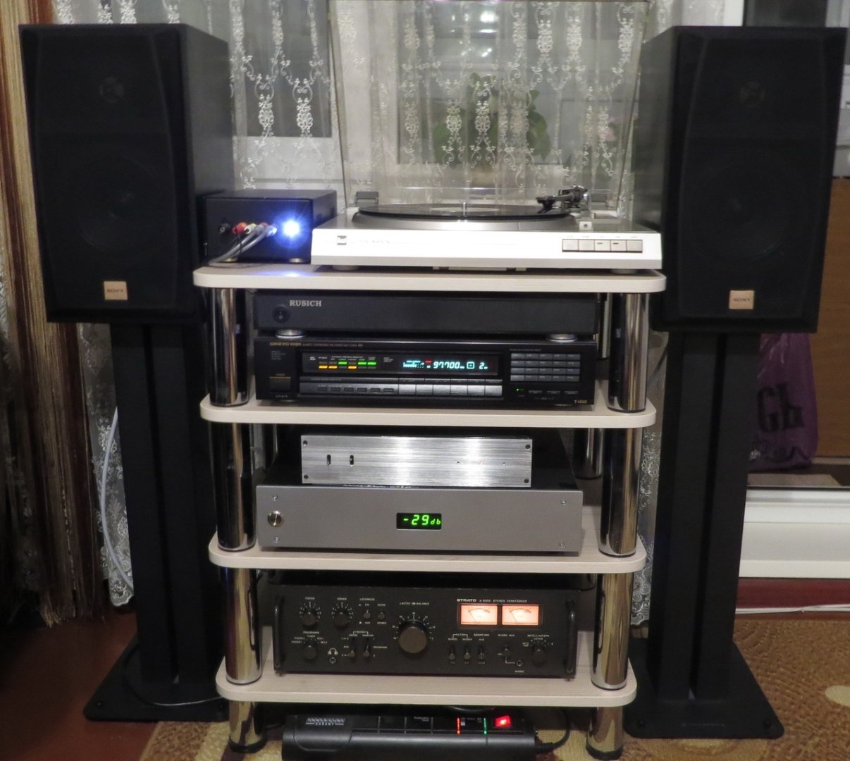 Мой девайс, в основном самопал: ЦАП, корректор, два усилка, нижний тоже самопал, внутри КВОД-405.