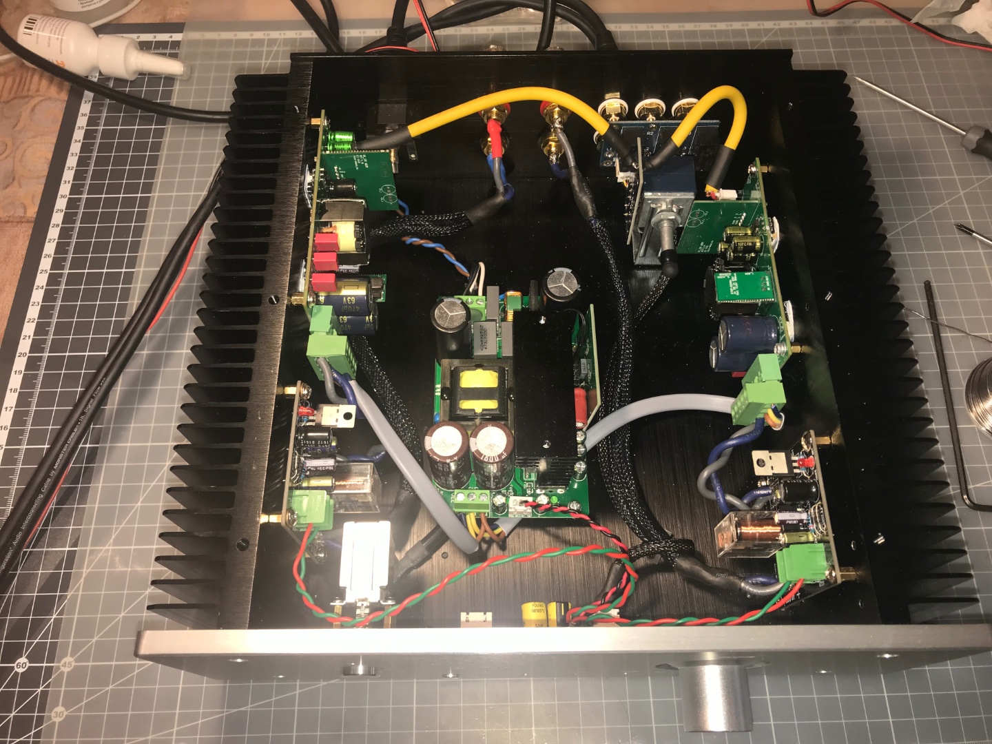 Добрый день, поздравляю всех с Новым годом! Вот что у меня получилось. Всё началось ещё в конце 20 года, наткнулся на видео Алекса, зарегистрировался на форуме, написал Юрию, и уже к середине февраля получил платы, все остальное пришло несколько позже, поэтому, плюс ещё ряд проблем, к сборке смог приступить только в декабре 21 года. Что делал и какие были проблемы. Перво наперво сделал доработку блока питания, как рекомендовал Юрий в видео (https://youtube.com/watch?v=n2G7bi4DD6Q&feature=share) получил 52,7в. Первое включение и полная тишина, но к этому был готов, 3.5 Вольта постоянка на выходе, доработка плат защиты (есть на форуме) обрезал дорожки, добавил резистор и всё завелось. Корпус, к сожалению, немного маловат, второй блок питания я не собирался ставить (комната 20 кв.м. мощности более чем достаточно на максимум даже не выкручивал ), но сплиттер после ибп хотелось бы добавить. Пока, 2 дня, слушал только винил, но остался очень доволен, появился объём, бас шикарный (колонки Triangle Borea 09). Остались мелочи, планирую добавить экран на ибп, попробовать впихнуть сплитер, немного упорядочить провода, ну, и самое главное, подобрать подходящую по размеру ручку Parker ((c) Alex). Спасибо Alex за вдохновение, Юрию за проект и помощь.