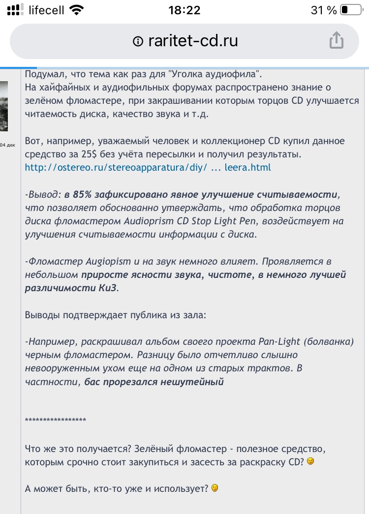 Кстати, как уже выше писалось - фломастер для улучшения качества звука на CD всего за $25! Его используют и получают супер результаты! Жесть.