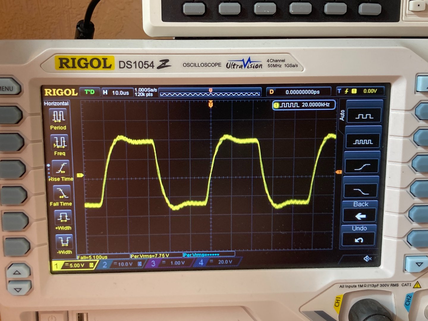 Замер меандра, входной конденсатор 22мкф не закорочен перемычкой. Замер при нагрузке 4 Ом, но при нагрузке 8 Ом результаты те же самые, ничего не меняется. Меандр отличный как для Д класса.