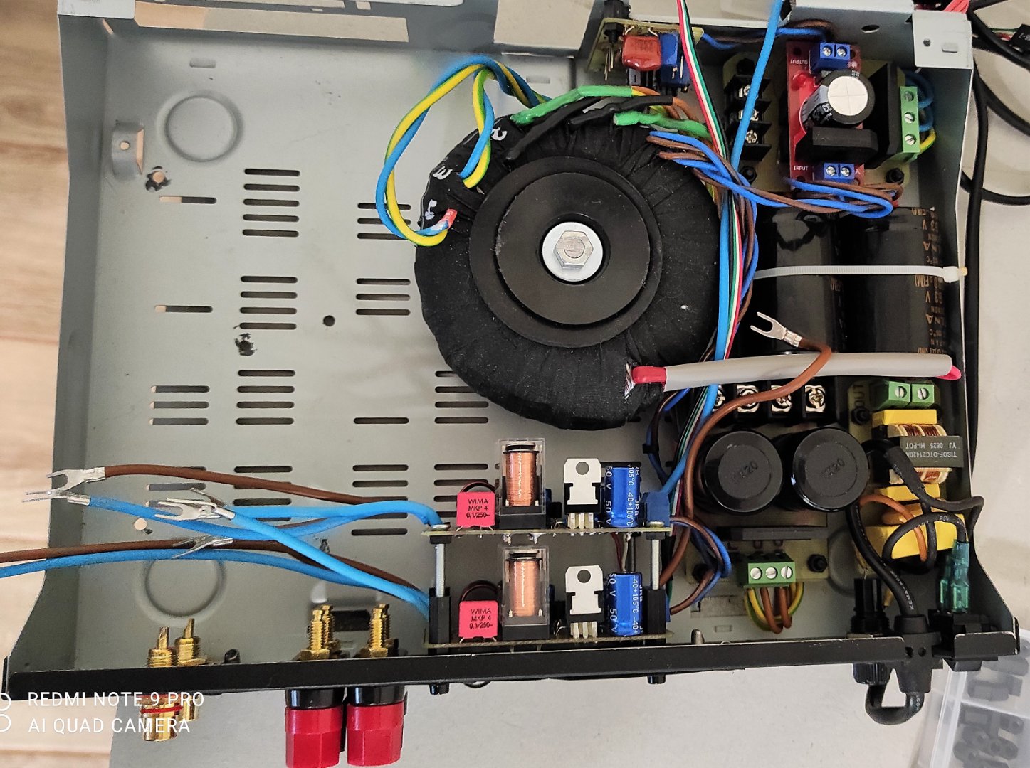 выпрямитель на каждый канал свой, сделал простенькие из диодных сборок, 2х6800мкФ и 2х10000мкФ конденсаторов которые уже были в наличии. питание трансформатора тоже через простенький фильтр из дросселя, варистора и нескольких конденсаторов.