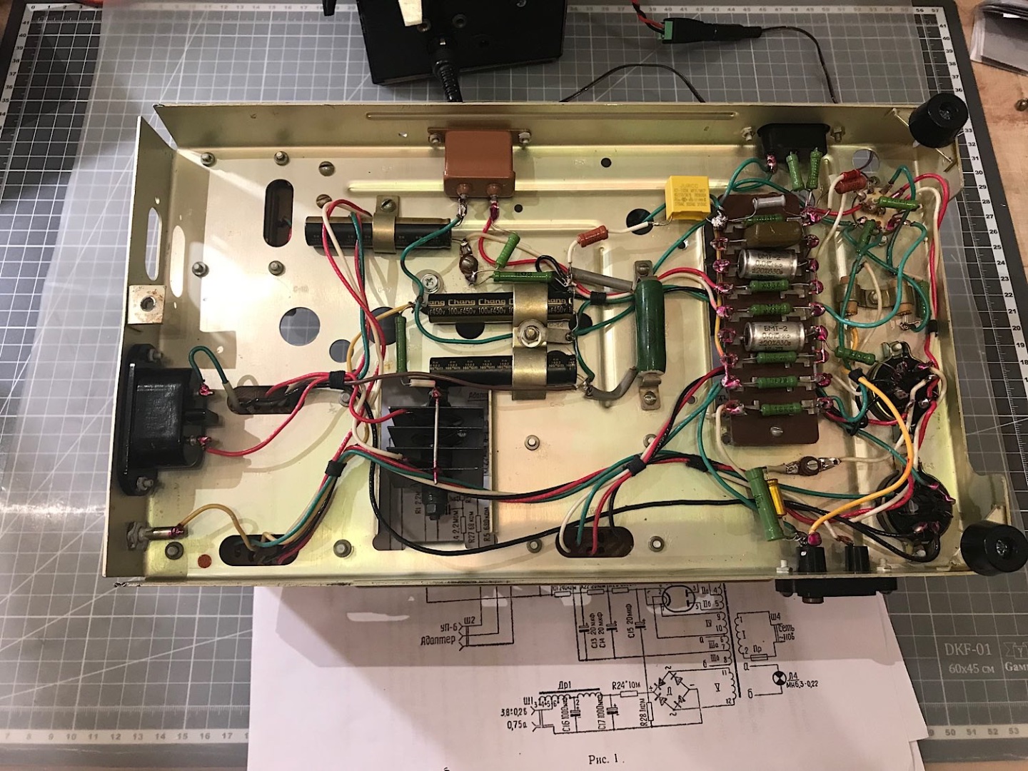 Добрый день. Руки чесались давно, года 3-4 назад, мне отдали 4 динамика 4А-32 с коробками. Позже, покупал ламповый приёмник, в гараже у продавца увидел этот усилитель от кинопроектора, блока питания у него не было и состояние было не известно, в целом человек мне его просто отдал. Почитав посты от Lektor, притащил усилитель из гаража, нашёл тор на 110в, и, о чудо, он завёлся! Конечно есть фон. Пока убрал темброблок, цепь питания звуковой лампы(был удивлён что дроссель стоит только в этой цепи), сам блок ФЭУ. Поменял конденсаторы, при этом конденсаторы в цепи питания звуковой лампы к50 1000x25v имеют емкость почти 1600 мкф и esr 0,28! 1975 года выпуска! В целом работает, но искажения слышны без приборов, пока магии не услышал, но такого расчёта сразу и не было. Планирую добиться от него приемлемого звука, для начала входной каскад заменить 6н2п на 6н9с, выходной на 6п3с, убрать ОС. Не кидайте в меня тапками, боюсь проект будет долгим, но есть желание на этом шасси собрать что-то полезное. Буду рад любым советам.