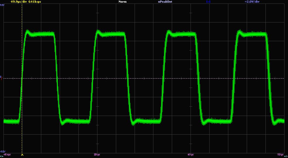 я тут ще трохи неправильний дросель впаяв, так як в мене міст, а навантаження 8Ом, то мав би бути розрахунок під 4Ом, а в мене вдвічі більші )) і щоби не випаювати дроселі, я зменшив ємність, від того трохи постраждав час наростання. Але запас на 20 кГц синуса є на повній амплітуді. Думаю, з перехідними викидами на викокогармонічному меандрі немає місту сильно заморочуватись, все рівно джерело не дасть такого спектру сигналу, щоби збуджувався фільтр демодуляції.