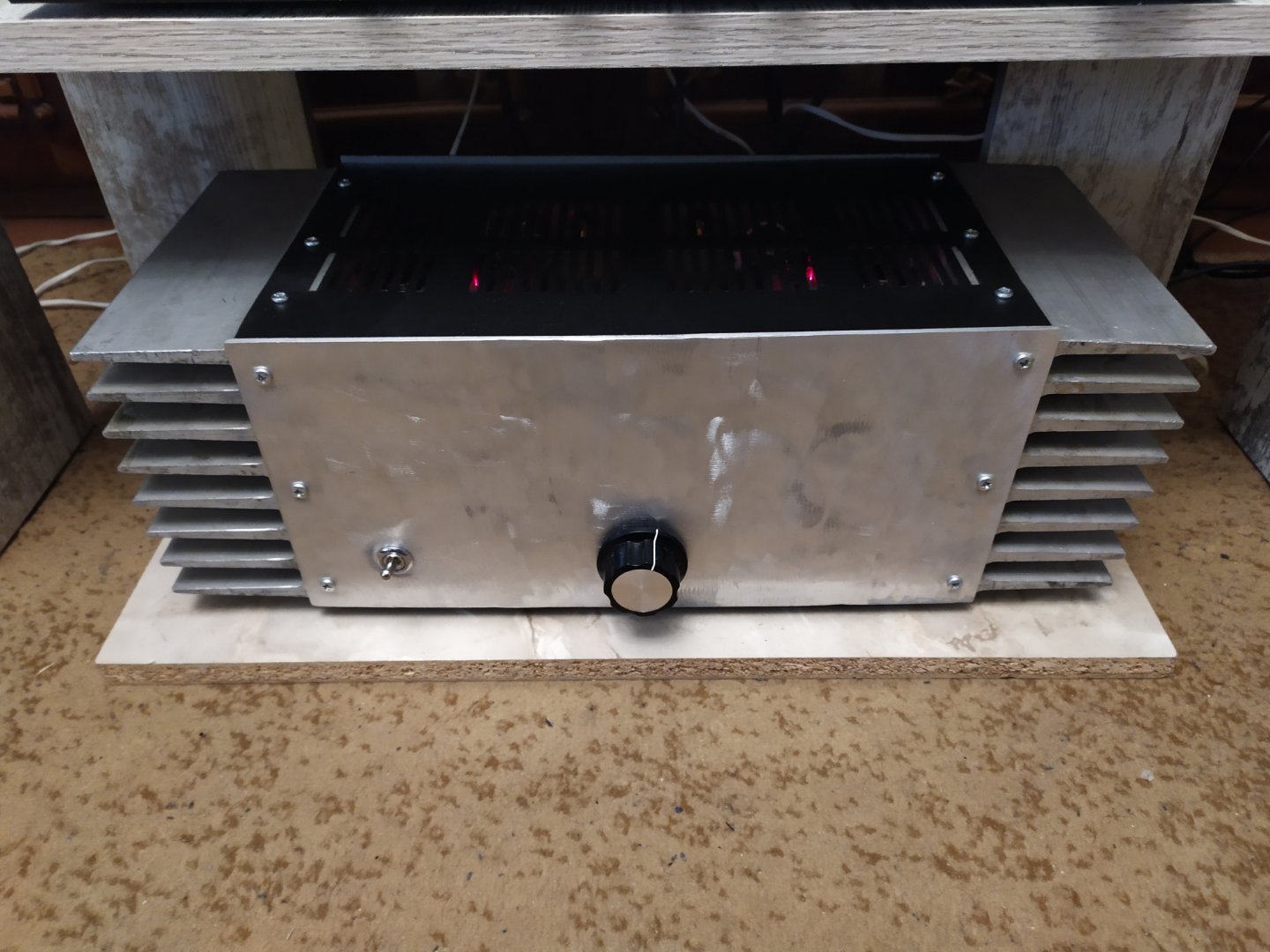 Знаю що не по феншую, :lol: інакше не виходило по довжині,та і так гріються десь градусів 50,там одного радіатора 5кг :) та й внизу пороблені прорізі і у верхній кришці дірок наробив.На передню панель ще будуть ставиться два стрілочних індикатора великих,знятих з підсилювачів У-100,шкалу трішки переробити треба під " Европейський " вигляд,тоді зовсім клас буде. ;)