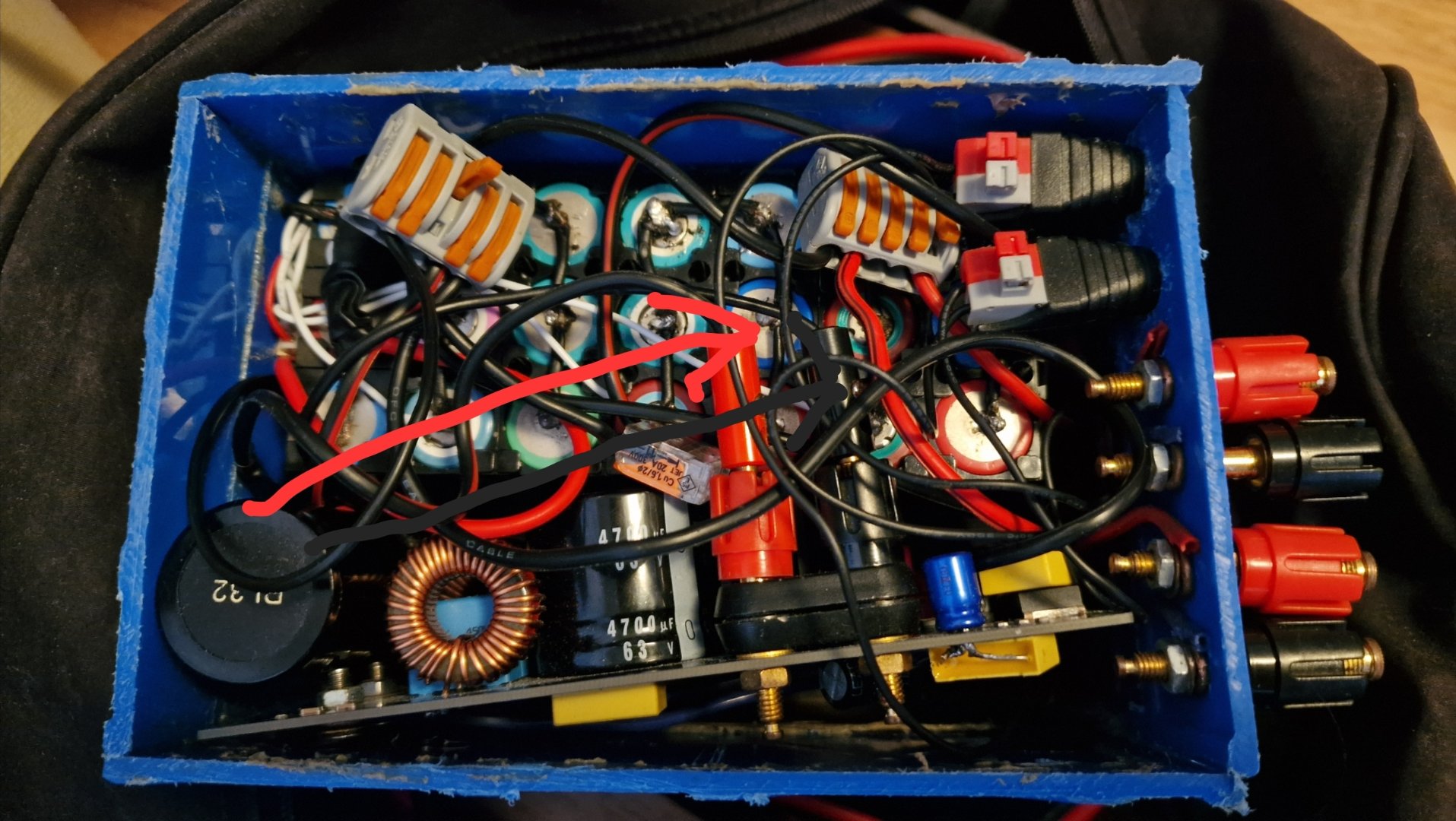 Мне только остается на прямую конденсаторы вот так подключить,места слишком мало,не много не рассчитал с размерами коробки 😁 Или лучше подпаять провода к родным конденсаторам и подключить к ним доп конденсаторы?