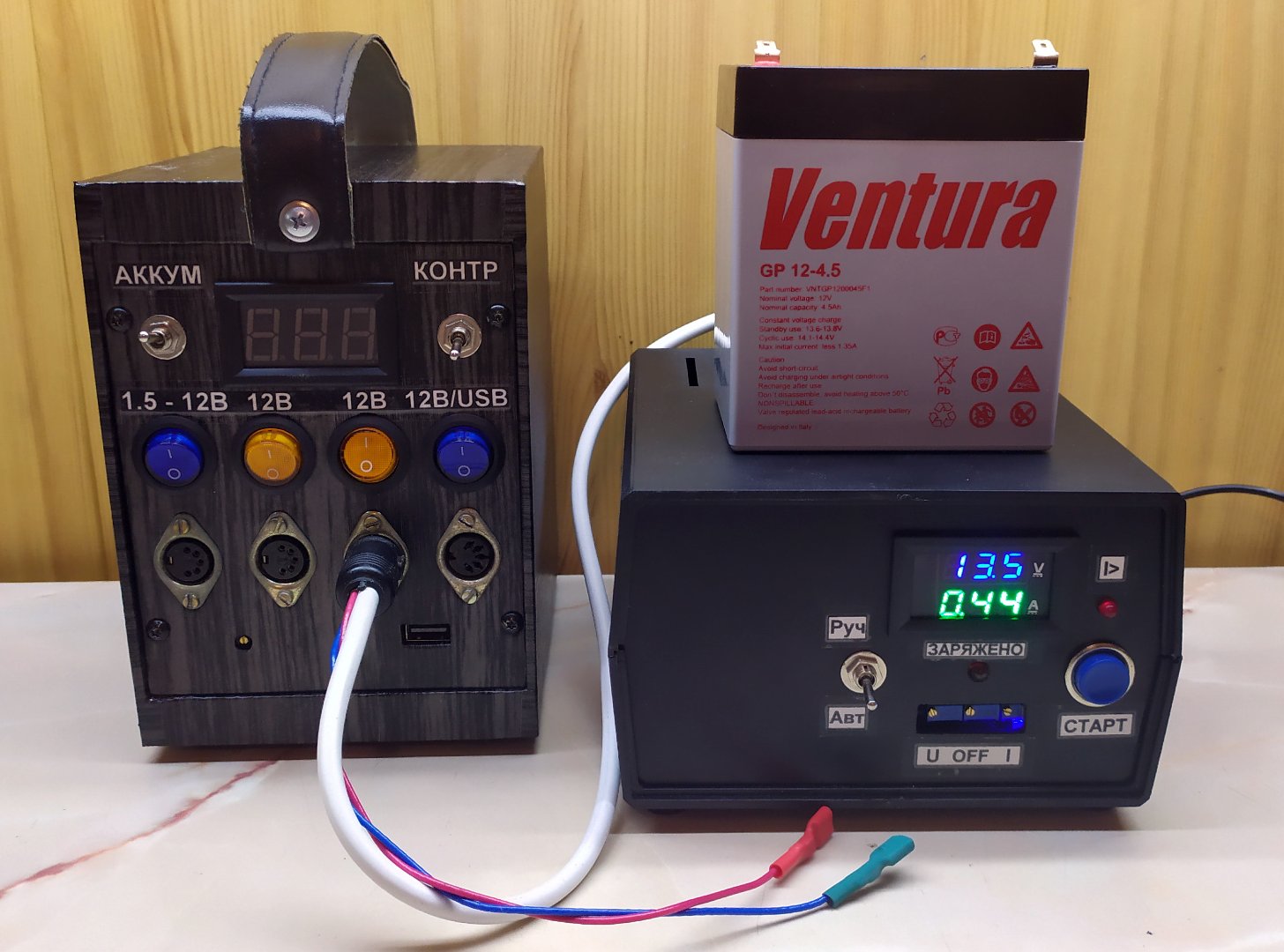 Для остальных потребностей, купил 2 гелевых аккумулятора 12В/4,5А. Хотел один ампер на 10-15, но по вменяемой цене нашёл только такие.