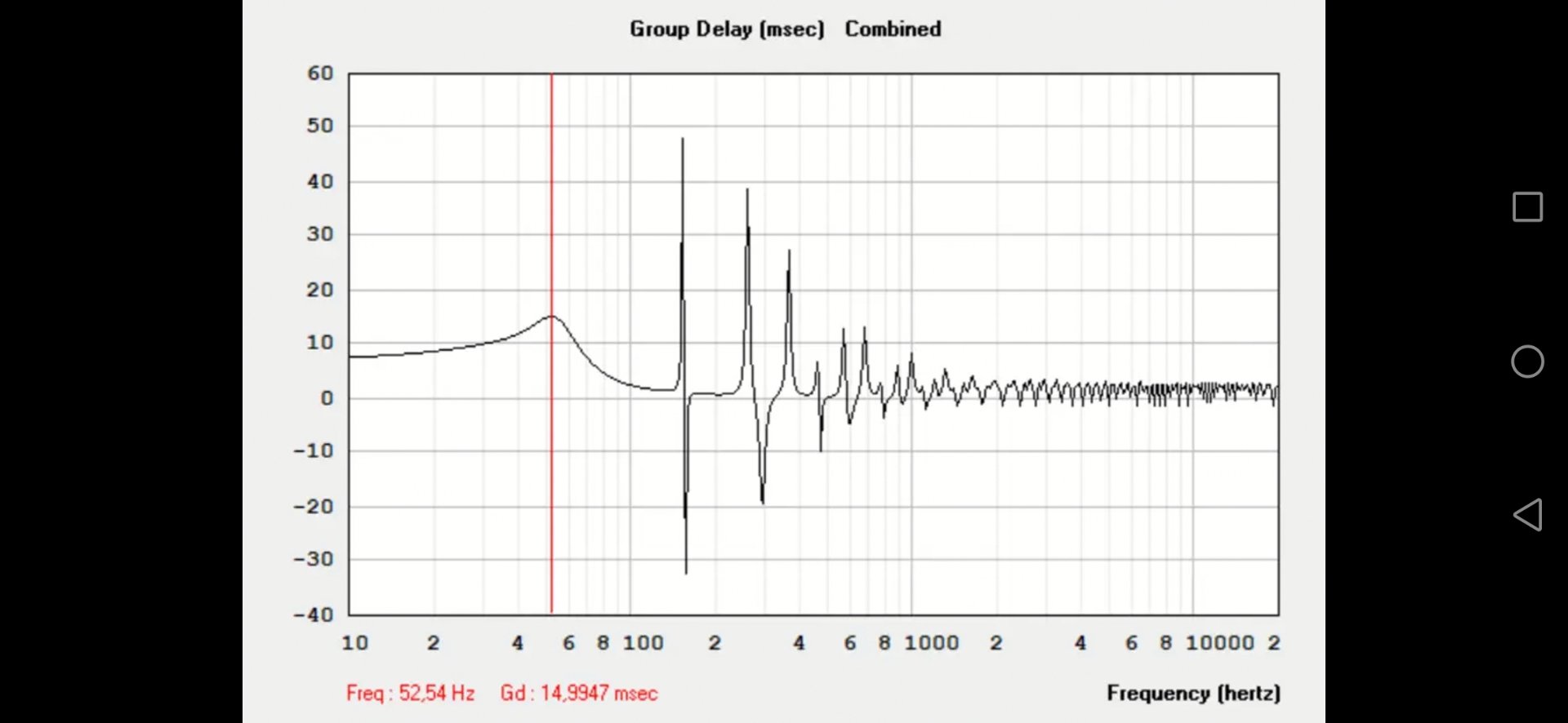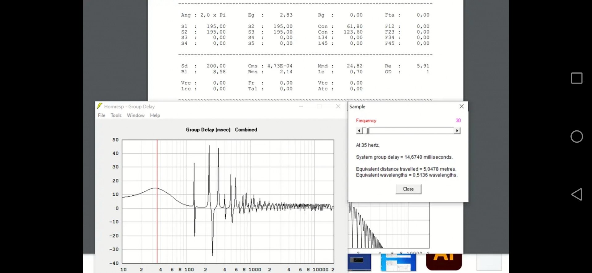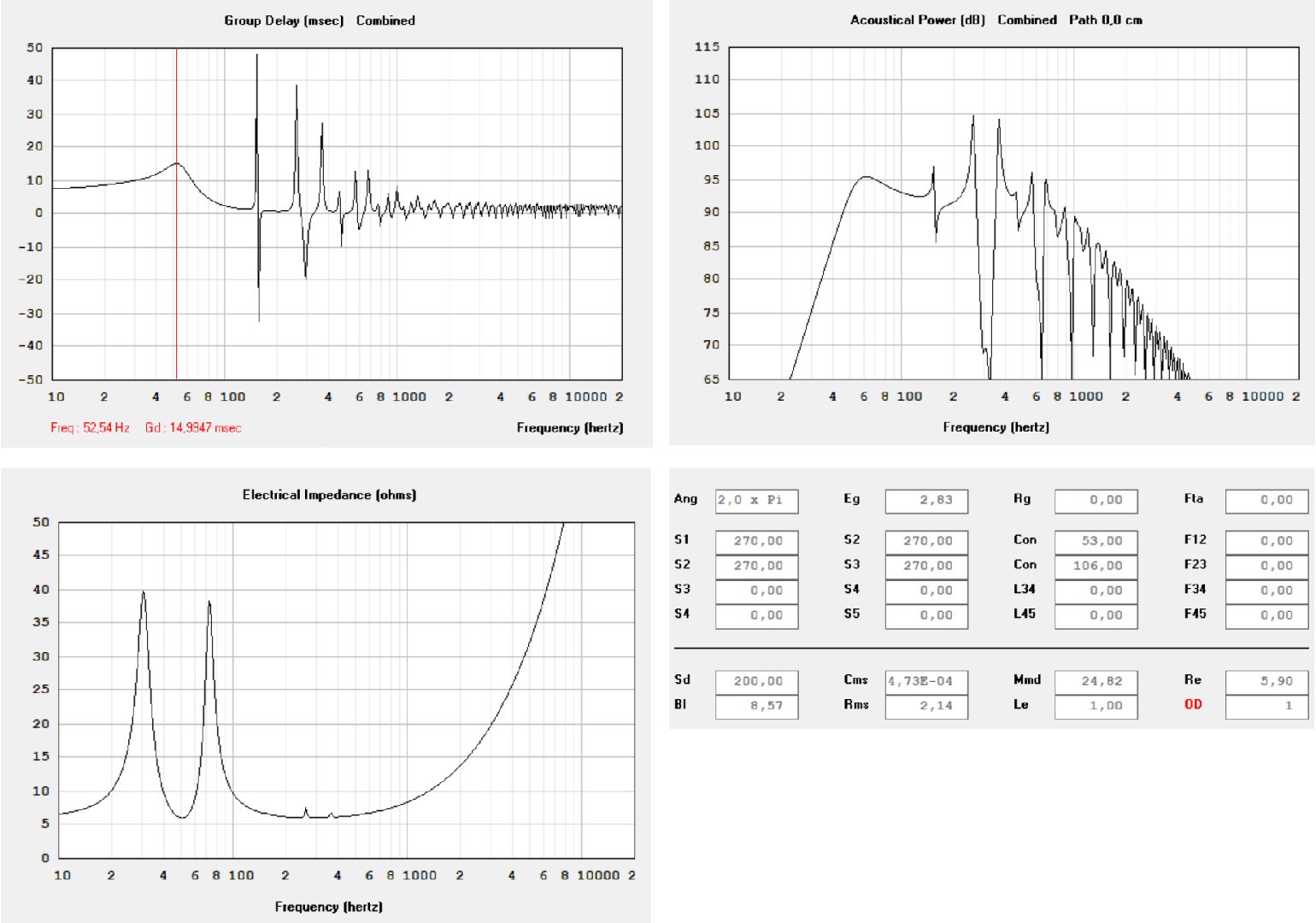 Что изменилось, по совету Александра порт был увеличен до 300см2, ну, а частота настройки трубы была смещена ближе к резонансной частоте динамика. Как видно из графиков, нижняя граница немного опустилась, при сохранении добротности +2.5дб, но ГВЗ выросли до 20мс.