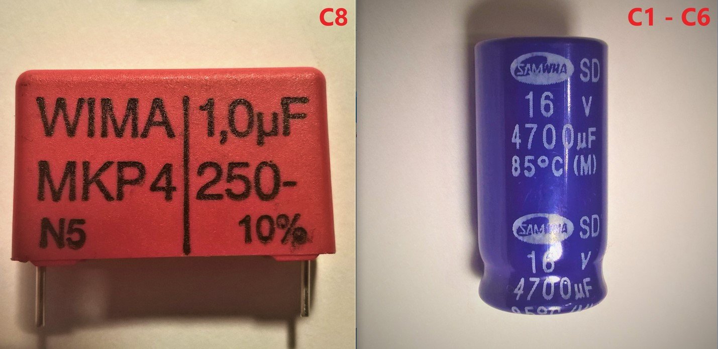 Как считаете, надо менять какие-то детали из купленных или ставить все какие есть? КД213Б, как я понял, даже лучше? C1-C6 - плюс 20 градусов вроде бы не решающие? С7 - "В" имеет ли значение, 400 Вольт достаточно? С8 - а бывают ли такие WIMA с меньшим допуском и важно ли это в данном случае? R1 на 2 ватта достаточно от перегрева?