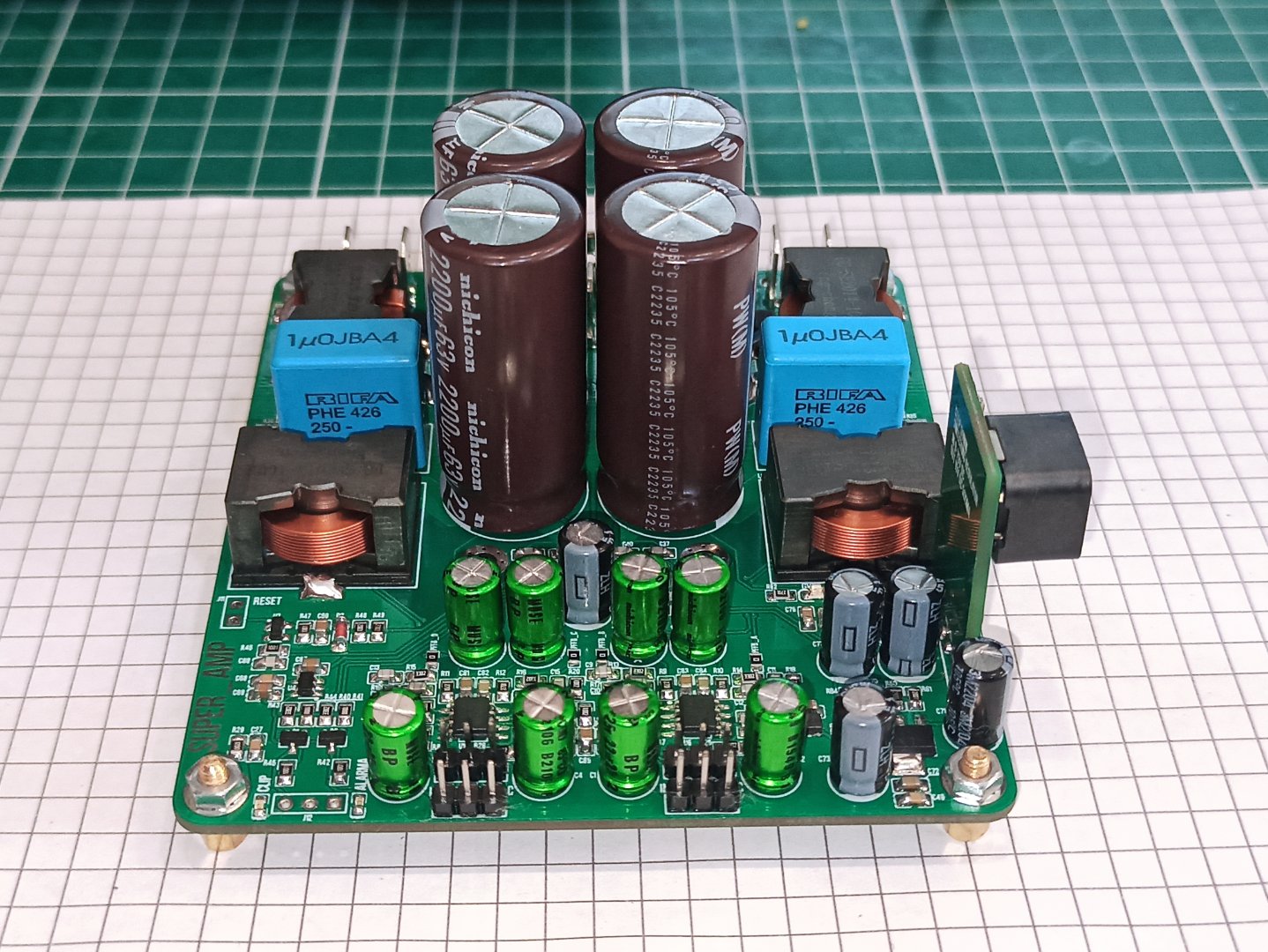 В LC фильтре будут применяться промышленная индуктивность, размеры мужские. С WIMA заморачиваться не стал, и выбор пал на ECWFA2J474J. В магазине кончились на 1uF этой же серии, пришлось разместить по 2шт, по этом пара не влезла красиво в ряд. Может найду что то другое и поправлю.