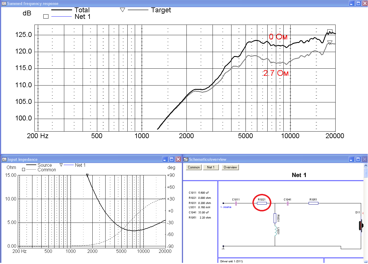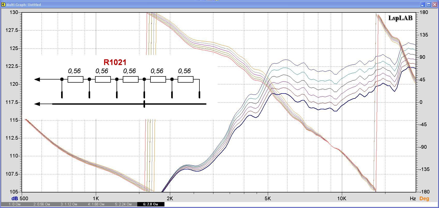 Ослабление, которое дают 2 последовательных резистора, около -4,5дБ. Минимальный импеданс на частоте 6-7 кГц, 5.8 Ом. Подавление на частоте резонанса -20дБ (не зря 3-й порядок поставили).