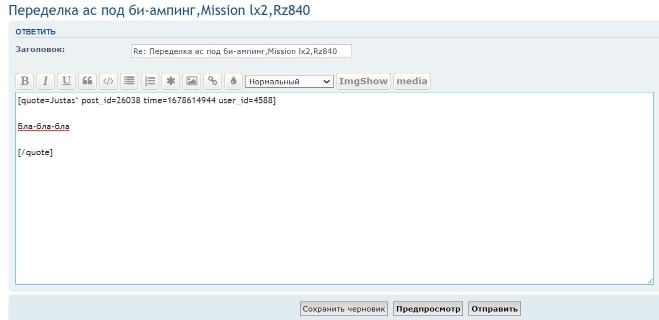 Нажали «Ответить с цитатой», оставили верх и низ, а в тексте удалили всё ненужное.