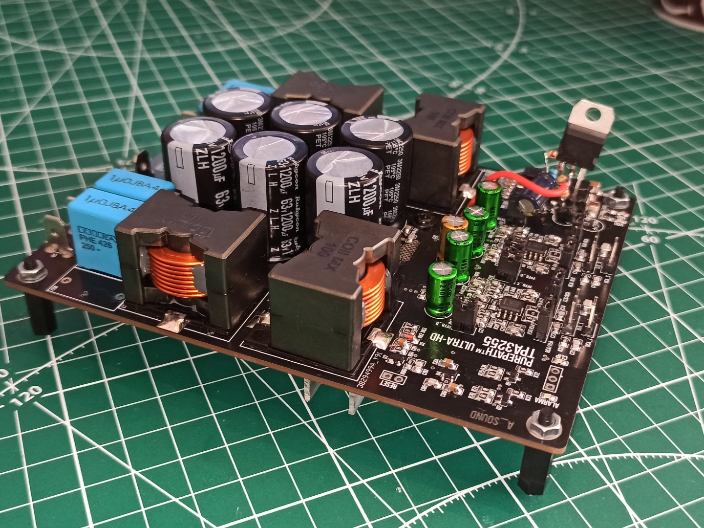В LC фильтре будут применяться промышленная индуктивность, размеры мужские. С WIMA заморачиваться не стал, и выбор пал на ECWFA2J474J. В магазине кончились на 1uF этой же серии, пришлось разместить по 2шт, по этом пара не влезла красиво в ряд. Может найду что то другое и поправлю.