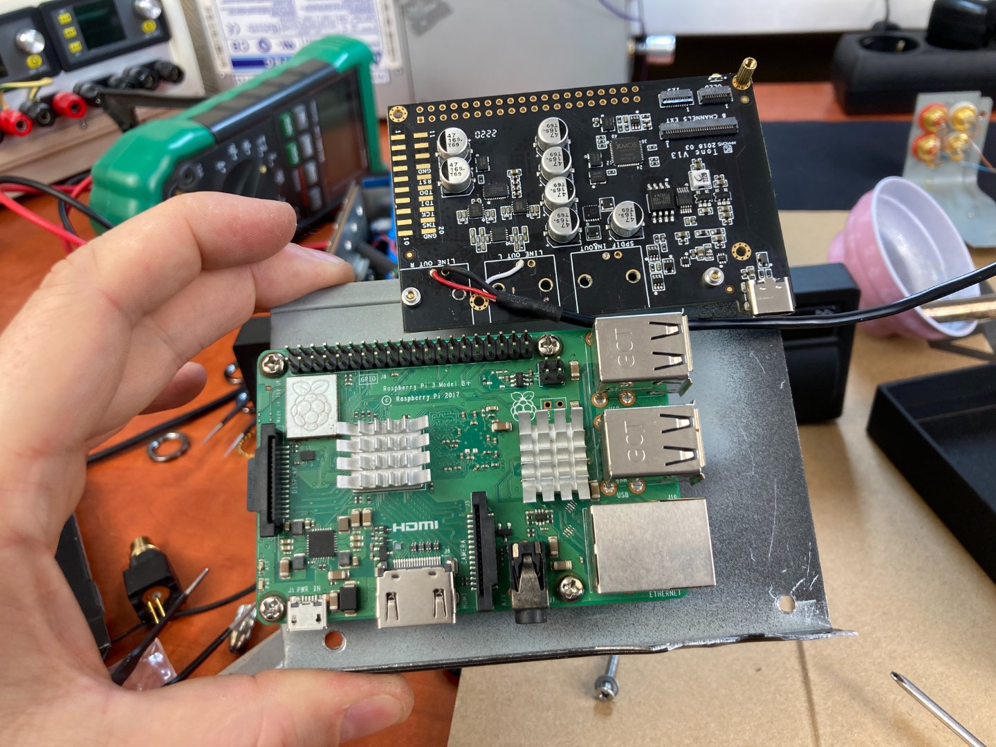 Решил сегодня пристроить платку Khadas ES9038Q2M USB DAC в свою магнитолу, также вернул на место Raspberry Pi B+ она намного быстрее загружается и работает, чем Raspberry Pi ZERO W (удивительно, да?), которую ставил на тест.