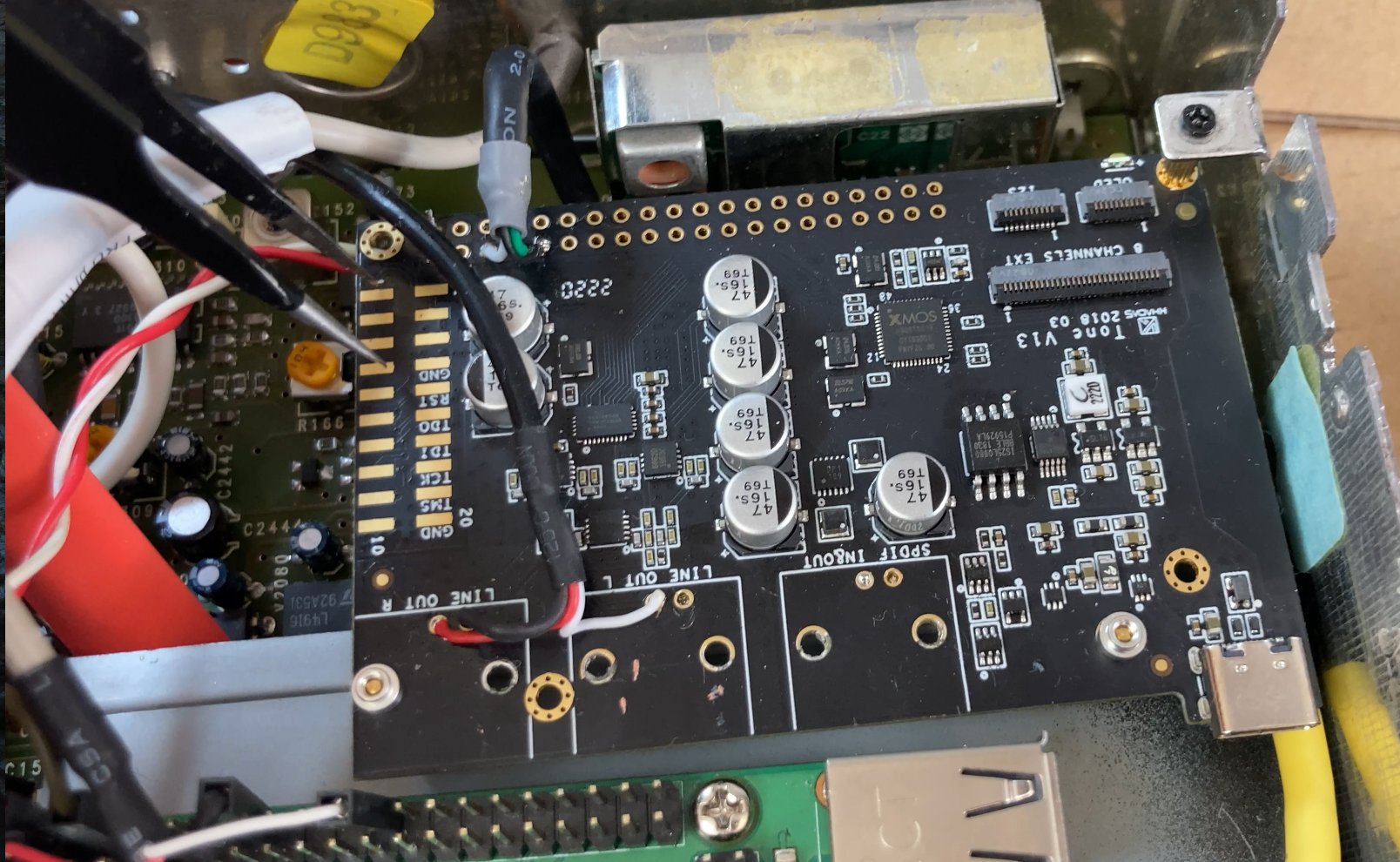 Питание решил сделать раздельное у малинки и Khadas, что бы не было по нему помех. Питание малинки гальванически развязано, с помощью этой платы. На Khadas разъем USB Type C не использовал, подал сигнал на саму плату с USB малинки. Пришлось сдуть все RCA с платы Khadas, не влезли, но бонусный цифровой выход я еще буду использовать