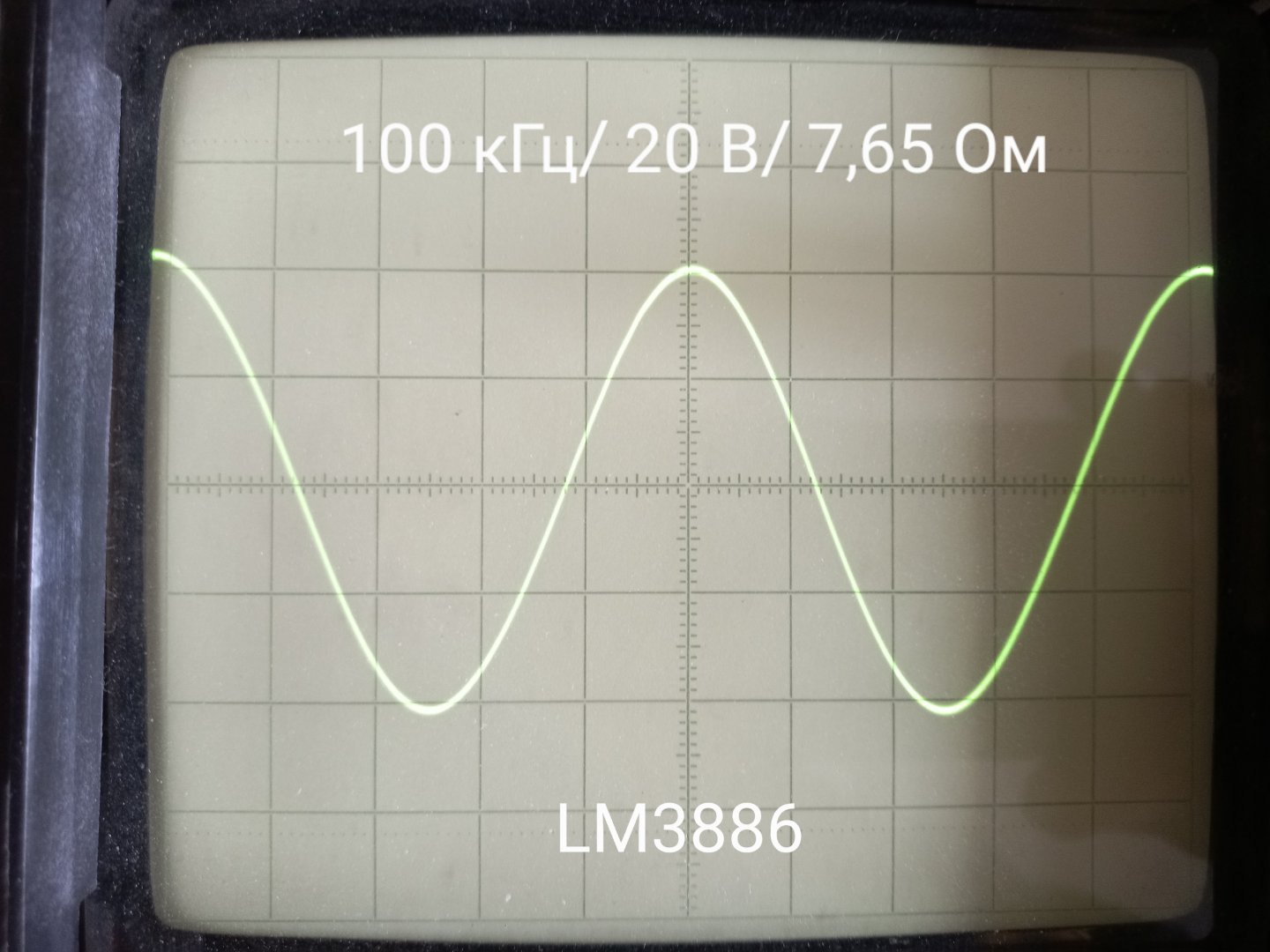 Меандр 20 Гц, 1 кГц, 10 кГц на нагрузке в виде проволочного резистора 7,65 Ом. Амплитуда 15 В.