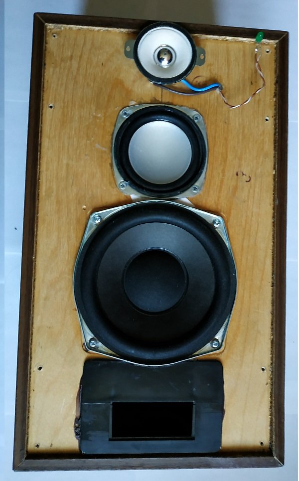 Далее динамики были интернированы в корпус от S30B, под СЧ динамик я сделал стакан в 1,5л т.е. изолировал его от НЧ динамика, а пищалка заняла свободное место над СЧ динамиком.