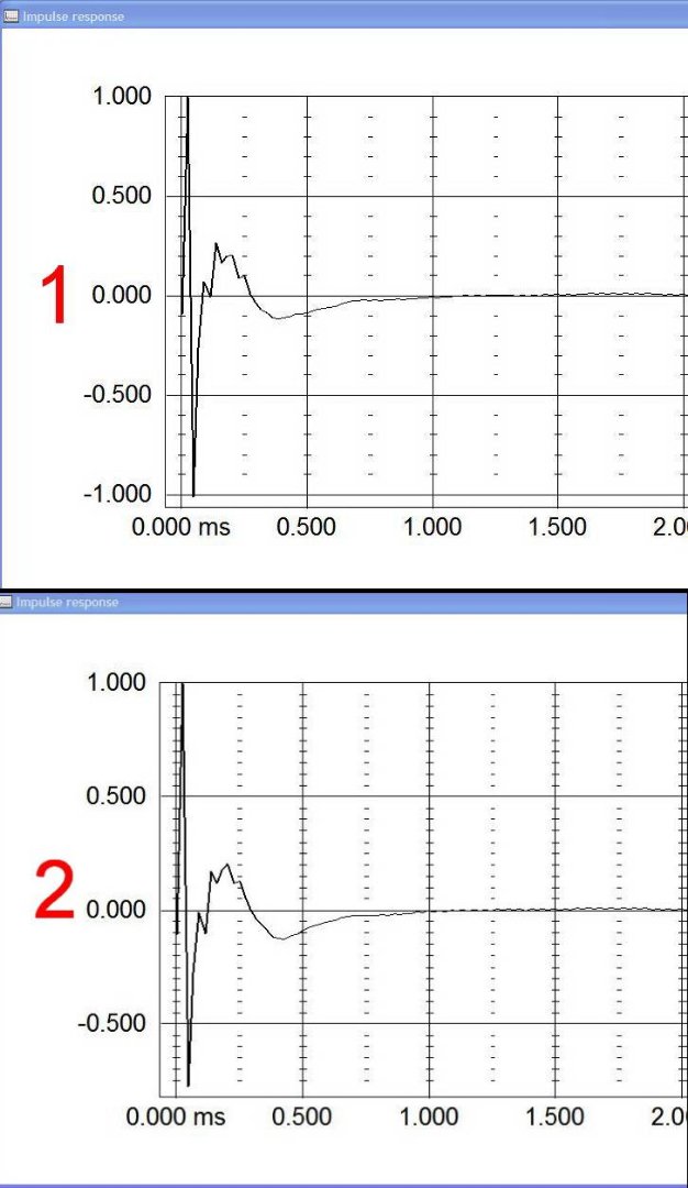 Начало какого импульса? Импульс по своей математической сути определён только в одной точке т.е. импульс и пик это синонимы. Если вести речь за импульсную характеристику АС, то она сложна к анализу в плане определения синхронности работы динамиков. Намного проще анализировать степ респонз, или же в русской аналогии - переходная характеристика или проще говоря ступенька. Суть импульса и суть степа проста, так как они в себе содержат все частотные составляющие сигнала от нуля до бесконечности, то они удобны для нахождения АФЧХ системы, когда мы пропускаем через канал, импульс или степ, то мы узнаём АФЧХ этого канала. Что степ что импульс это одного поля ягоды, но читать импульс сложно, намного проще читать степ особенно если нужно увидеть синхронность работы полос в АС т.к. степ на своём фронте содержит практически всю нужную информацию, если сигнал от ВЧ приходит раньше чем от СЧ, то это на степе очень хорошо видно. Ну и чисто для справки, степ (ступенька) в себе содержит постоянную составляющую которую АС не способна воспроизвести, именно по этому после резкого нарастания сигнала, начинается спад сигнала, спад который показывает что канал ограничен по постоятнке т.е. не пропускает её. Но в плане ровной фазы в полосе пропускания АС это всё не важно т.к. именно фронт ступеньки в себе несёт информацию о ровной фазе в полосе пропускания канала, и на этом фронте всё очень хорошо читается.