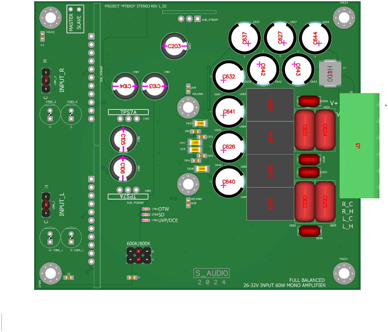 Sous писал(а): 28 ноя 2023, 21:26 Усилитель с монополярным питанием. Максимальная мощность 100Вт/4Ом, 150Вт/2Ом.