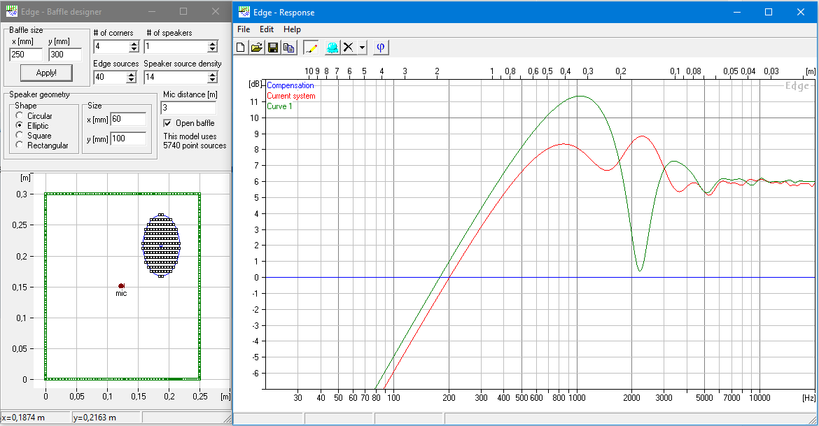 Если абстрагироваться от того что с АЧХ сделает комната, то для безэховой камеры модель выглядит так: С баффлом 235мм, излучение в 4π начинается ниже 400Гц, с 335мм – ниже 300Гц.