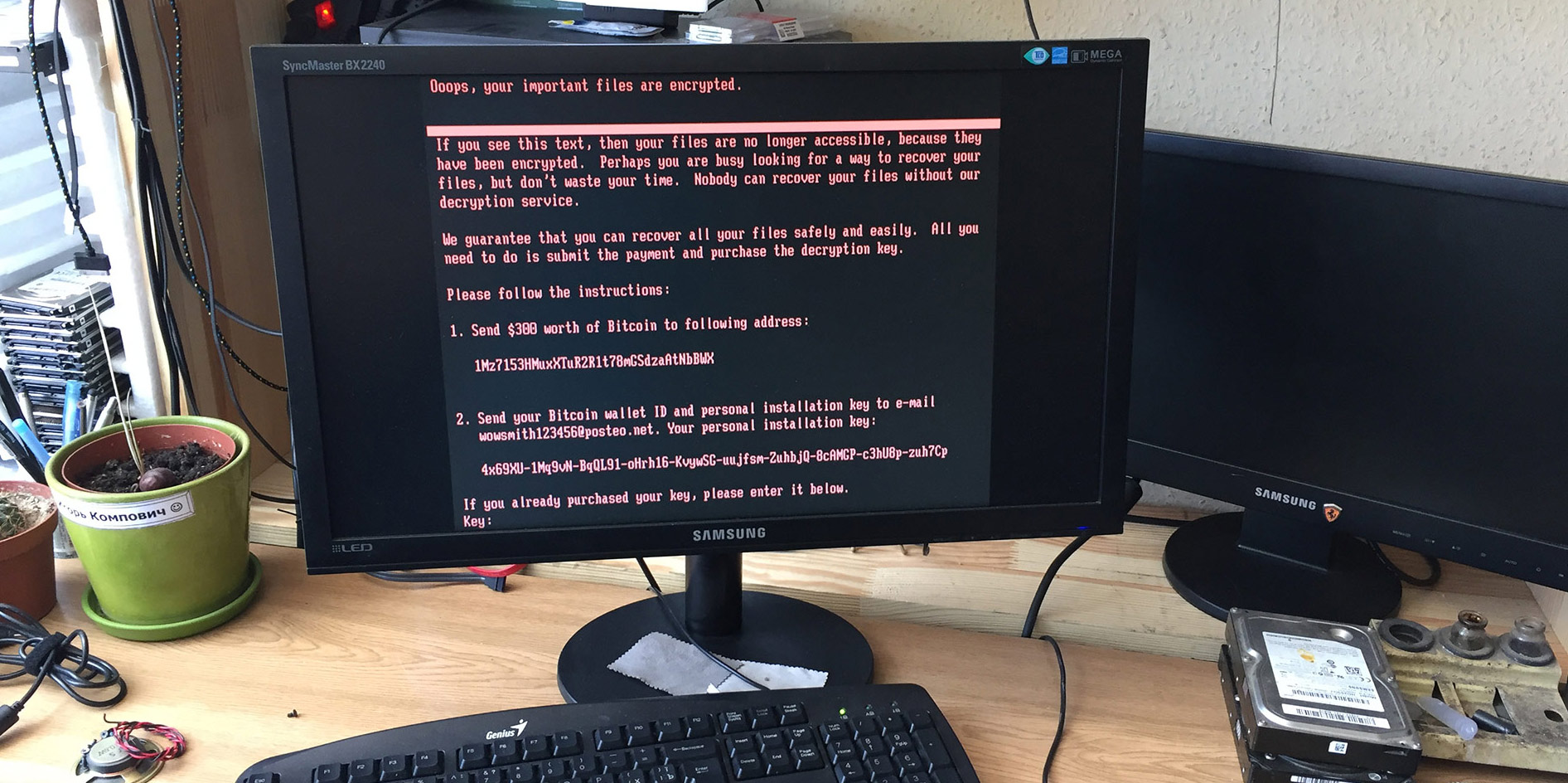 Вот пример вируса крипто вымогателя на одном из компьютеров клиента. Вирус прописался в загрузчик, зашифровал все данные на компьютере и требует выкуп 300$. В данном случае нам удалось разшифровать данные, но это очень редкое везение. Антивируса на компьютере не было.