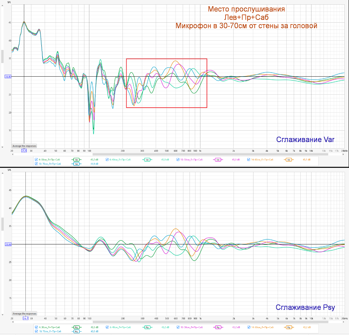 Ещё раз сделал контрольные замеры. Микрофон между АС, в 30-40-50-60-70см от стены.