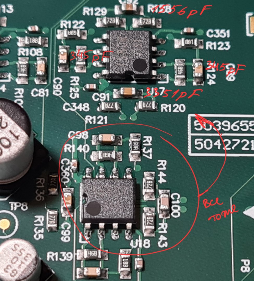 Ок, все выложу наглядно. Но пока все еще раз хочу перемерить, у меня не сходятся некоторые номиналы кондеров с автором проекта. Притом что процентов шестьдесят сходится. Возможно мы и разные каналы апгрейдили, но все равно все каналы по обвязке наверное должны быть по соответствию одинаковые. Возможно ревизии плат разные. Но ОУ то одни и те же . У меня небольшой опыт. Так что ХЗ, может допустимы такие отклонения номиналов. Сегодня вечером постараюсь еще раз промерить по номерам кондеров, как у автора. Тогда составлю и поделюсь сравнительным списком