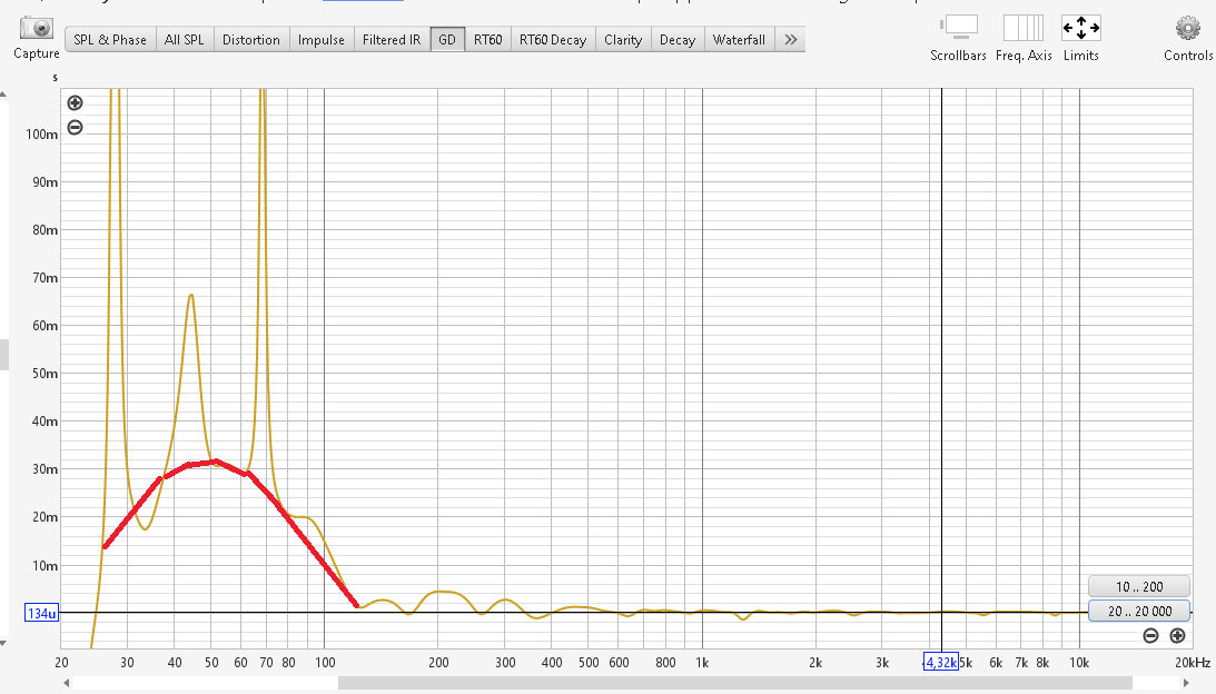 А це групова затримка яка як би показує в мілісекундах на скільки кожна частота відстає, піки на графіку це наслідок розривів другого роду у ФЧХ при вимірюванні в реальних умовах, коротше на них можна не звертати увагу в цьому прикладі, я червоною лінією окреслив групову затримку яку ви бажаете компенсувати затримкою, як видно з графіка нам потрібно вводити різний час затримки на різній частоті. Проста затримка не може врахувати такі гірки.
