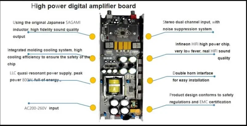 Стоимость порядка $60. Чип усилителя Infineon MERUS MA5332MS. Сайт производителя сообщает, что это чип является наследником серии IR43x2M и обещает выходную мощность в 120Вт на канал на 6Ом нагрузке при напряжении питания +\- 40В и 1% THD+N. Сопротивление нагрузки от 2 Ом до 8 Ом и рисует такую картинку: