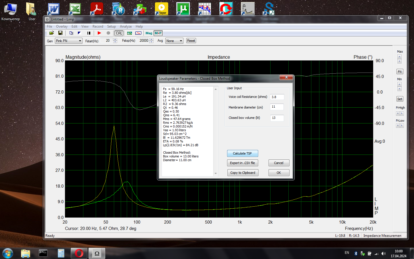 Длина трубы 60мм диаметр 50, поэтому, я просто не знал куда смотреть, теперь понял между горбами где самый меньший импеданс там и частота настройки ФИ, правильно я понял?