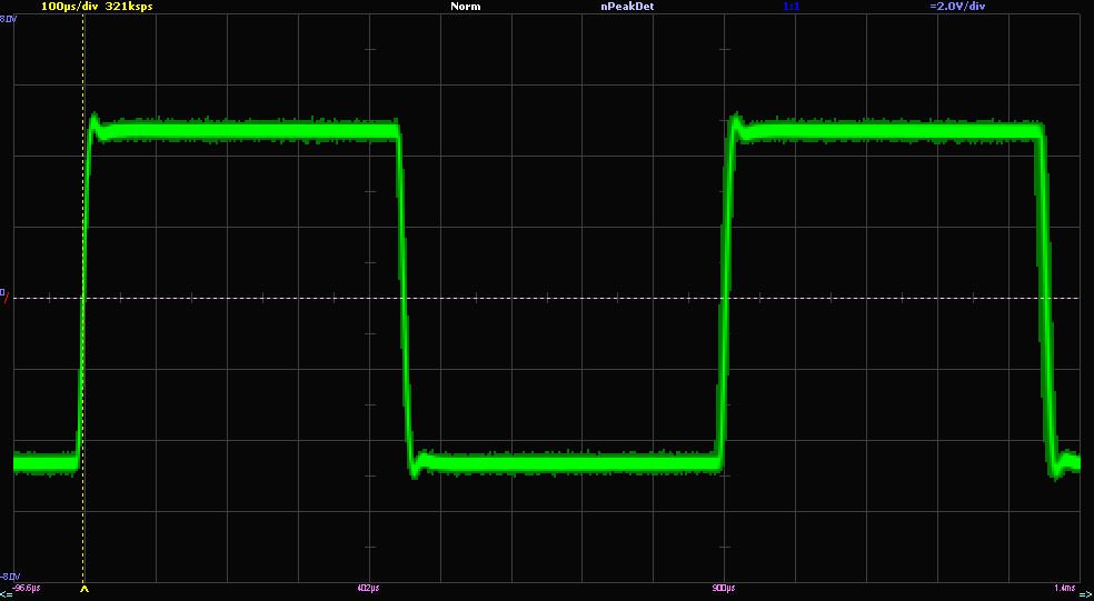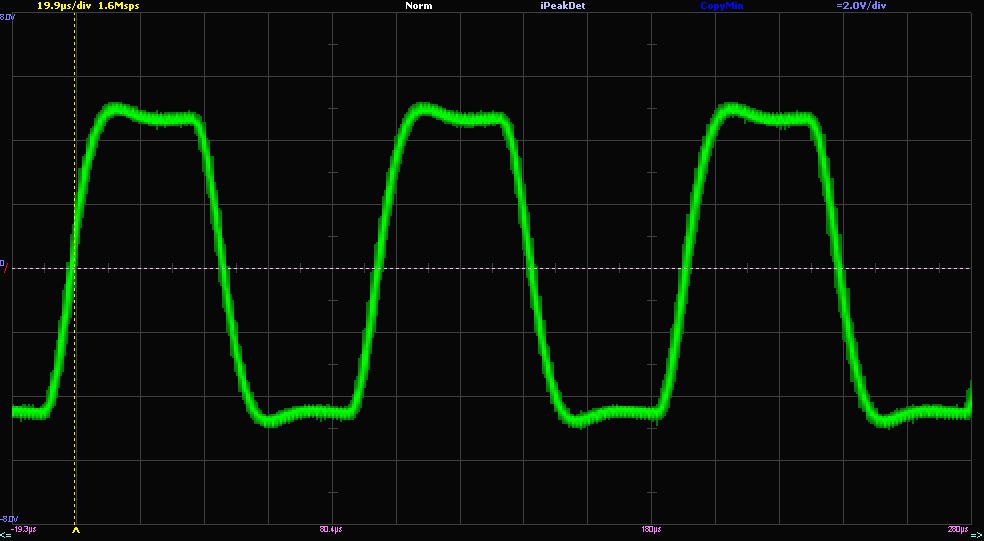 я тут ще трохи неправильний дросель впаяв, так як в мене міст, а навантаження 8Ом, то мав би бути розрахунок під 4Ом, а в мене вдвічі більші )) і щоби не випаювати дроселі, я зменшив ємність, від того трохи постраждав час наростання. Але запас на 20 кГц синуса є на повній амплітуді. Думаю, з перехідними викидами на викокогармонічному меандрі немає місту сильно заморочуватись, все рівно джерело не дасть такого спектру сигналу, щоби збуджувався фільтр демодуляції.
