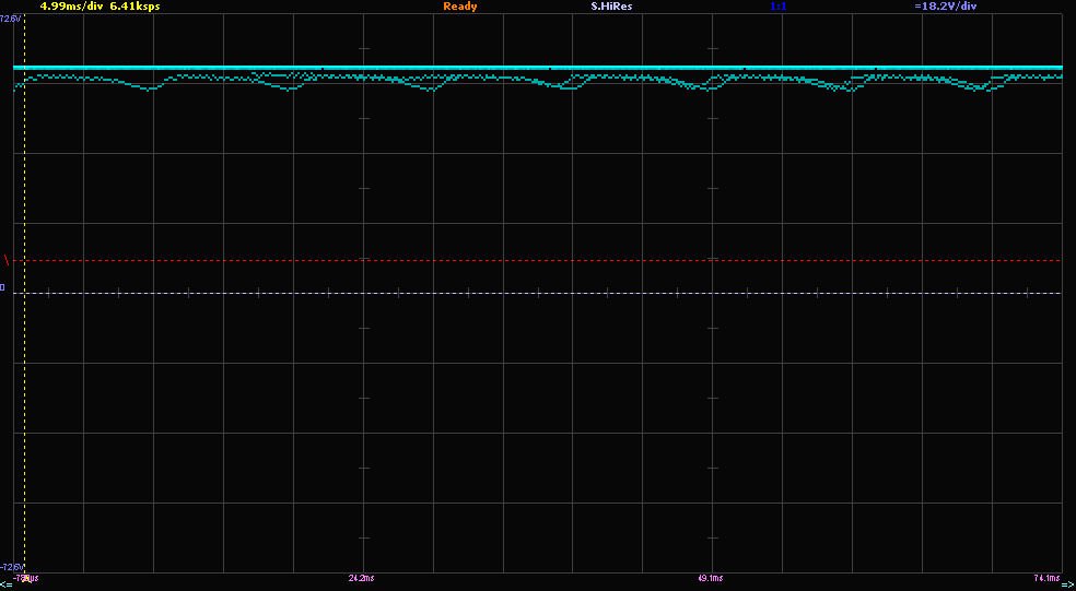 Ось сьогоднішній результат. Навантаження резистором ~3А, 59В (174 Вт). І це на виході конденсатор 220мкФ замість 1000 (тимчасово для кращої візуалізації). Пульсації 100гц та 80кгц відносно невеликі (режим пікового вимірювання).