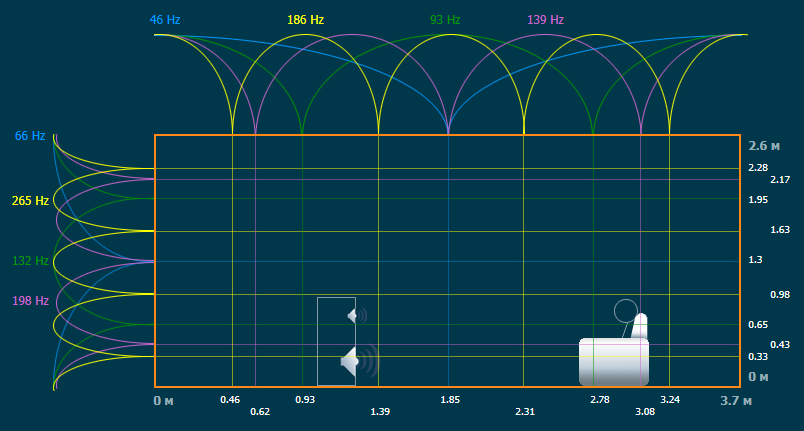 Судя по частоте 46Гц, расстояние стена-стена около 3,7м.