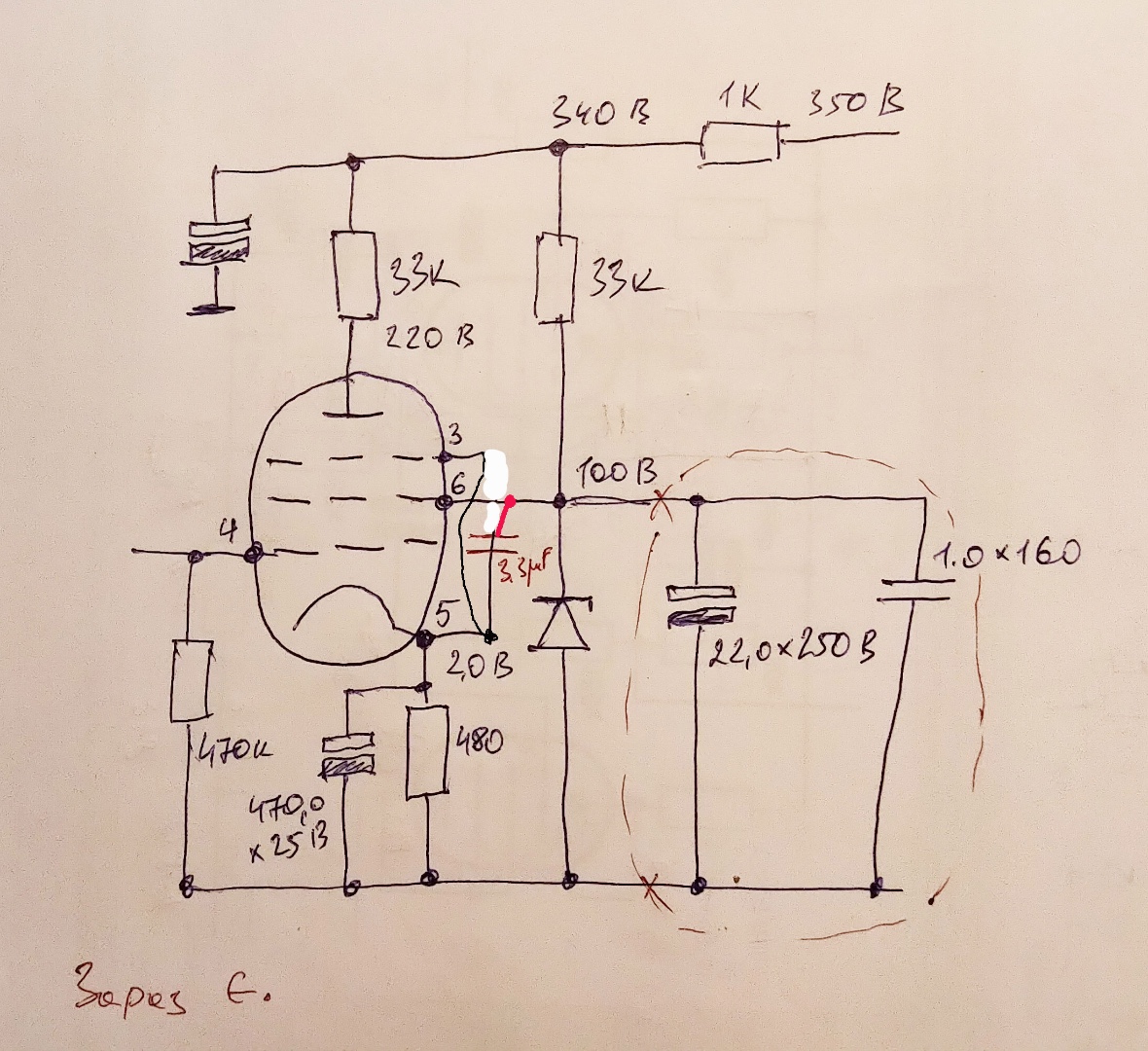 Гляньте будь ласка на ось цю схему, що получилася після суботніх настройок. Червоним зазначено конденсатор, що я залишив, після того, як стабілітрона анодом посадив на землю. Коло, обведене червоним не існує. Можливо зняти конденсатор 3,3 мкФ і включити це коло?