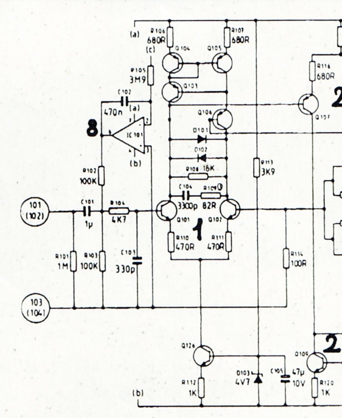 мне думается, что операционник тут интегратором работает. И во всём звуковом диапазоне частот у него выходное сопротивление будет весьма низким. Так что им можно пренебречь, и считать R102 R103 включенными параллельно входу усилителя.