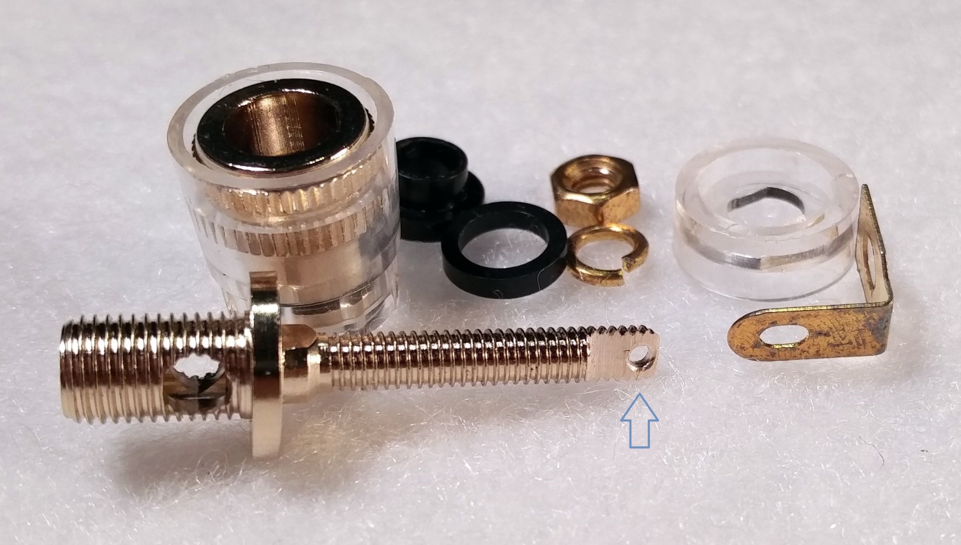 Почав з роз'ємів для акустики в підсилювач, "бананів" та іншого. Алекс вже робив відео, де випробовував матеріали з яких все це добро зроблене, тому особливих сюрпрайзів не очікував. Та все ж.... Дуже муляє, що китайці нехтують самими відповідальними місцями. А саме: в цьому роз'ємі контактна планка, до якої припаюється сигнальний дріт, зроблена із чорного металу (притягується магнітом, аж бігом). І якщо інша дрібнота, яка фіксує всю конструкцію - гайка, гроверна шайба теж з чорняги, то це не так страшно. Отож пропоную просте рішення, щоб спокійно спати вночі - припаятись до стрижня безпосередньо. Для цього потрібно небагато - напилком зняти шар металу з двох сторін. Ну і бажано б висверлити отвір для вставляння дроту (рукоділля на фото).