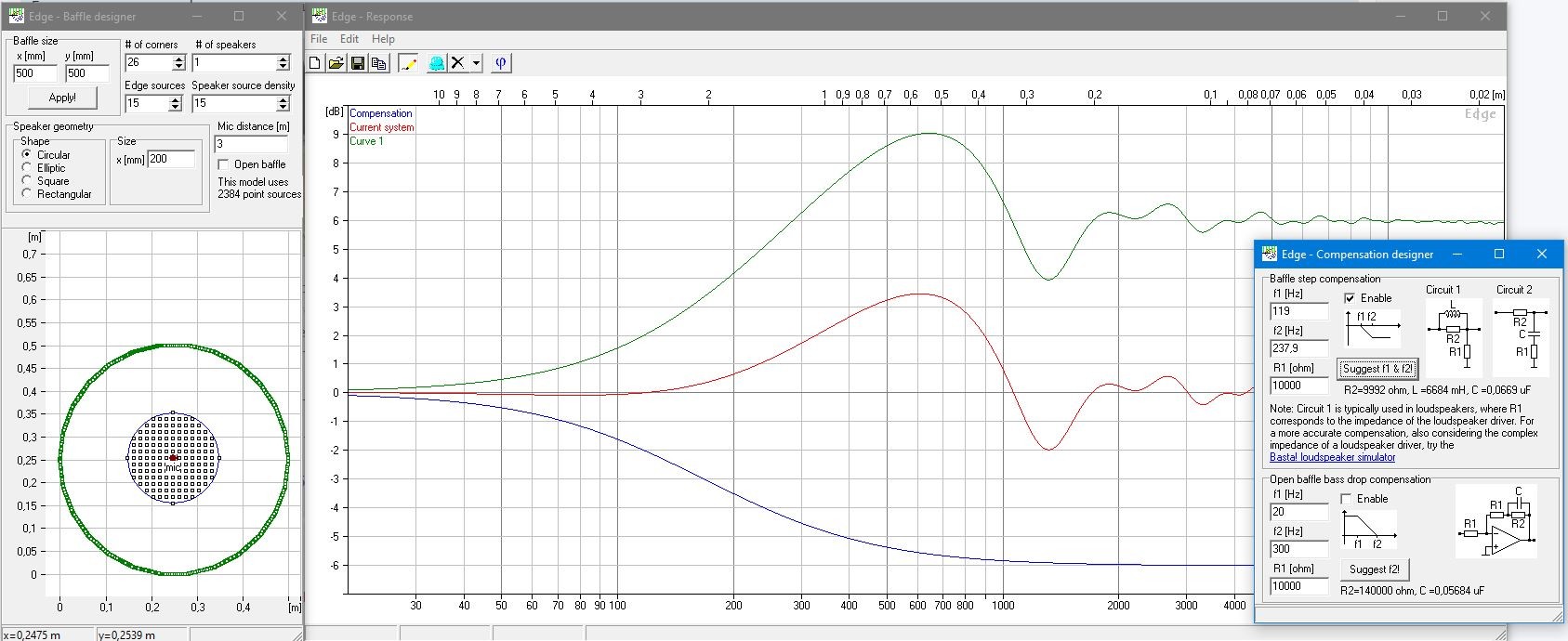 На горб и провал в диапазоне 300 – 2000Гц, внимания не обращайте. Это симуляция краевой дифракции для круглого, но плоского баффла.
