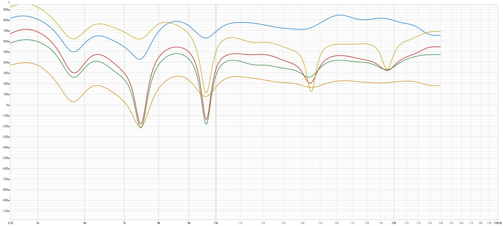 У меня вот такая картина,все замеры в одном месте,импульсы слишком разнятся,однако я узнал про другой более точный способ как выровнять динамики по задержке,это прогнать оба от 0 до 24khz и потом посмотреть разницу во вкладке group delay,